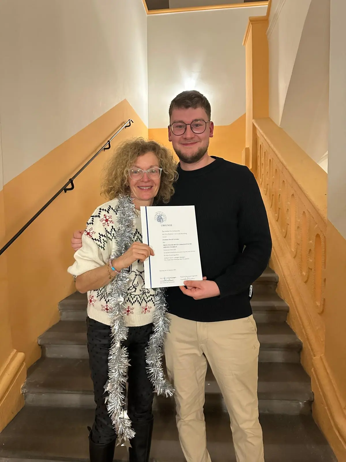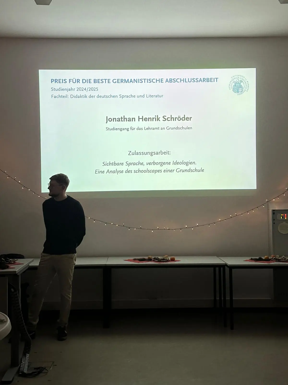 Jonathan Schröder erhielt für seine Zulassungsarbeit zum Thema „Sichtbare Sprache, verborgene Ideologien. Eine Analyse des schoolscapes einer Grundschule“ den Preis für die beste germanistische Abschlussarbeit in der Deutschdidaktik. Er wurde auf der Weihnachtsfeier der Germanistik dafür geehrt. Wir gratulieren!