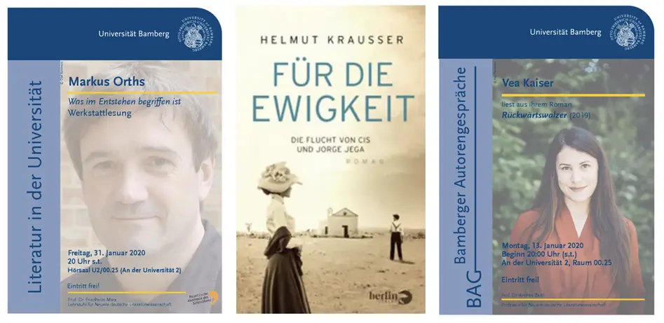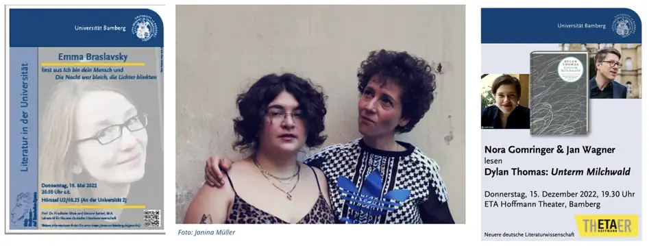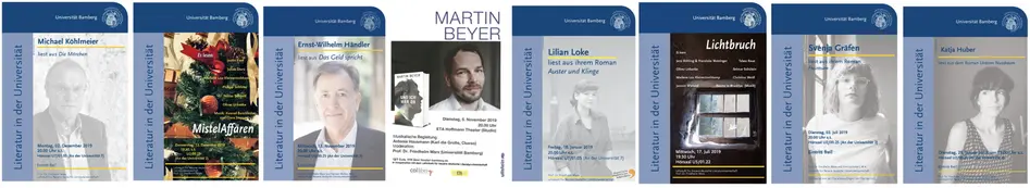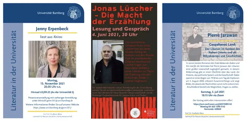 So lasen auf Einladung des Lehrstuhls für Neuere Deutsche Literaturwissenschaft bereits Uwe Johnson (1979), Adolf Muschg (1980), Ralf Rothmann (1988, 2004), Martin Walser (1979, 1993, 2008), Felicitas Hoppe (1997, 2003), Norbert Gstrein (2005), Katharina Hacker (2010), Eva Menasse (2014), Robert Schindel (2015), Lilian Loke (2016/19), Abbas Khider (2017), Franzobel (2018), Simon Strauß (2018), Arno Geiger (2018), Ingo Schulze (2018), Katja Huber (2019), Martin Beyer (2019), Ernst Wilhelm Händler (2019), Vea Kaiser (2020), Markus Orths (2020), Helmut Krausser (2020), Jonas Lüscher (2021), Pierre Jarawan (2021), Rainald Grebe (2021), Jenny Erpenpeck (2022), Norbert Gstrein (2022), Emma Braslavsky (2022), Roman Ehrlich (2022), Hengameh Yaghoobifarah und Sasha Marianna Salzmann (2022), Paul Maar (2023), Manuel Niedermeier (2023), Katerina Poladjan (2023), Rolf-Bernhard Essig und Kâmil Benli (2023), Paul Ninus Naujoks (2023), Sharon Dodua Otoo (2023) und Olga Martynova (2023) an der Universität Bamberg.