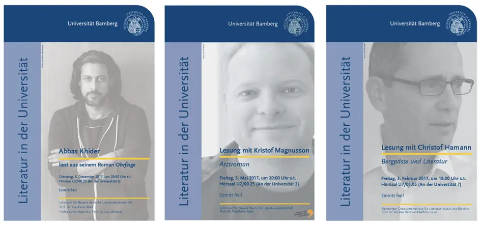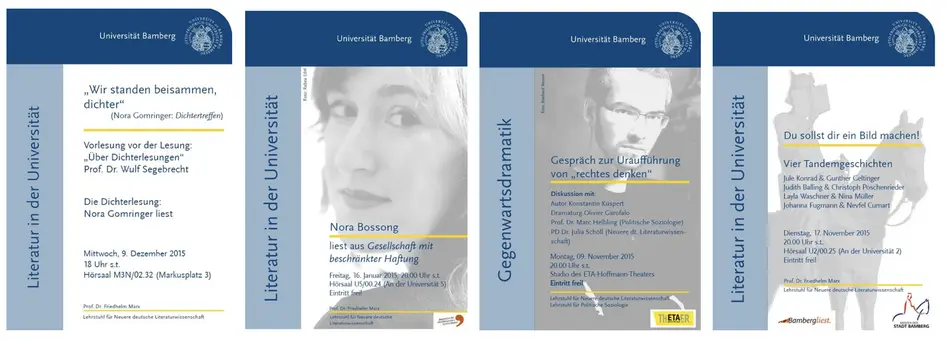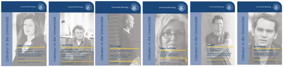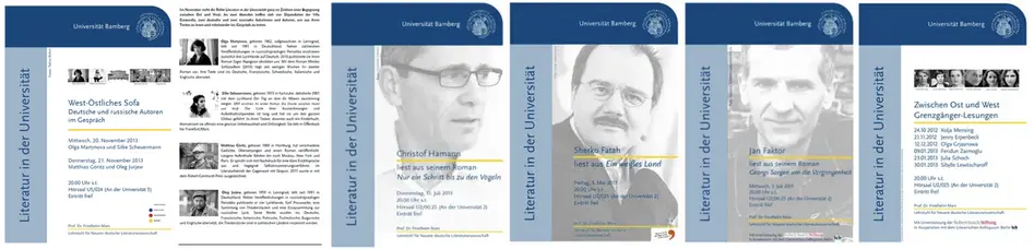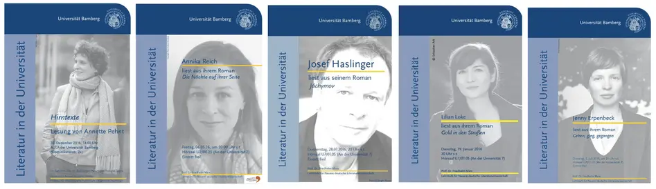 So lasen auf Einladung des Lehrstuhls für Neuere Deutsche Literaturwissenschaft bereits Uwe Johnson (1979), Adolf Muschg (1980), Ralf Rothmann (1988, 2004), Martin Walser (1979, 1993, 2008), Felicitas Hoppe (1997, 2003), Norbert Gstrein (2005), Katharina Hacker (2010), Eva Menasse (2014), Robert Schindel (2015), Lilian Loke (2016/19), Abbas Khider (2017), Franzobel (2018), Simon Strauß (2018), Arno Geiger (2018), Ingo Schulze (2018), Katja Huber (2019), Martin Beyer (2019), Ernst Wilhelm Händler (2019), Vea Kaiser (2020), Markus Orths (2020), Helmut Krausser (2020), Jonas Lüscher (2021), Pierre Jarawan (2021), Rainald Grebe (2021), Jenny Erpenpeck (2022), Norbert Gstrein (2022), Emma Braslavsky (2022), Roman Ehrlich (2022), Hengameh Yaghoobifarah und Sasha Marianna Salzmann (2022), Paul Maar (2023), Manuel Niedermeier (2023), Katerina Poladjan (2023), Rolf-Bernhard Essig und Kâmil Benli (2023), Paul Ninus Naujoks (2023), Sharon Dodua Otoo (2023) und Olga Martynova (2023) an der Universität Bamberg.