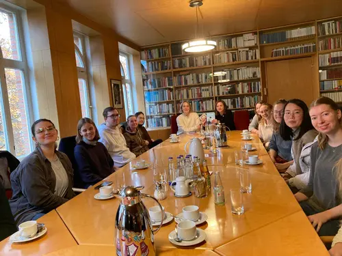 Im Anschluss daran besuchten die Studierenden das Studienzentrum der Herzogin Anna Amalia Bibliothek. Dort wurden sie durch das Gebäude geführt und erhielten Einblicke in dessen Geschichte, Bestand und Sammlungsschwerpunkte. Daran anschließend stand die Besichtigung der Vulpiusgalerie im historischen Bibliotheksgebäude auf dem Programm, die beim Brand von 2004 stark beschädigt wurde. Die Führung vermittelte einen detaillierten Eindruck von den Restaurierungsarbeiten an den sogenannten Brandbüchern. Ein besonderes Highlight bildete die Präsentation ausgewählter Bände aus Goethes Privatbibliothek, an denen sich Lesespuren des Dichters nachvollziehen ließen.