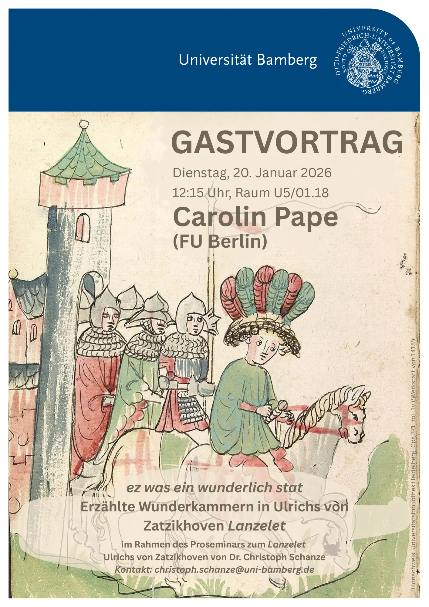 Am Dienstag, dem 20. Januar 2026, kommt Carolin Pape (FU Berlin) für einen Gastvortrag zu uns nach Bamberg. Im Rahmen des Lanzelet-Proseminars von Christoph Schanze spricht sie über Lanzelets wundersames Liebeszelt. Der Titel des Vortrags lautet: "ez was ein wunderlich stat. Erzählte Wunderkammern in Ulrichs von Zatzikhoven Lanzelet".