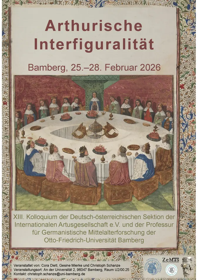 Vom 25. bis zum 28. Februar findet an der Universität Bamberg ein Kolloquium zum Thema "Arthurische Interfiguralität" statt, das die Professur für Germanistische Mittelalterforschung mit Schwerpunkt Digital Humanities & Neue Medien (Prof. Dr. Gesine Mierke) in Kooperation mit der Deutsch-österreichischen Sektion der Internationalen Artusgesellschaft (Präsidentin: Prof. Dr. Cora Dietl, Justus-Liebig-Universität Gießen) veranstaltet.