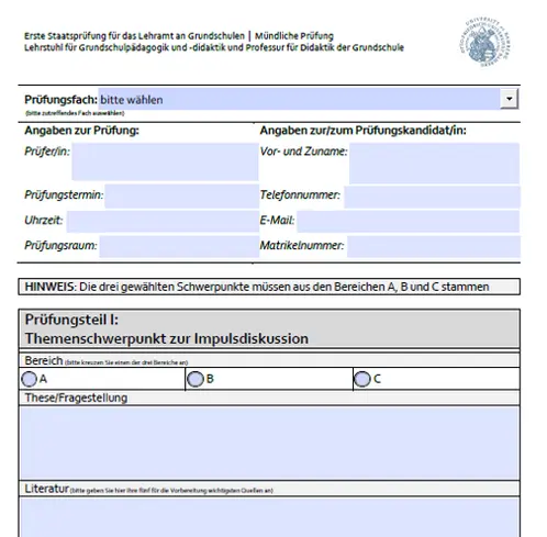 Hier(1.5 MB, 2 Seiten) finden Sie ein pdf-Formular. Dieses laden Sie bitte vollständig ausgefüllt spätestens 14 Tage vor Ihrem Prüfungstermin im VC-Kurs "Aktuelle Information zum Grundschullehramtsstudium" hoch. Sie finden hierzu eine direkte Abgabemöglichkeit für die einzelnen Prüfer:innen.