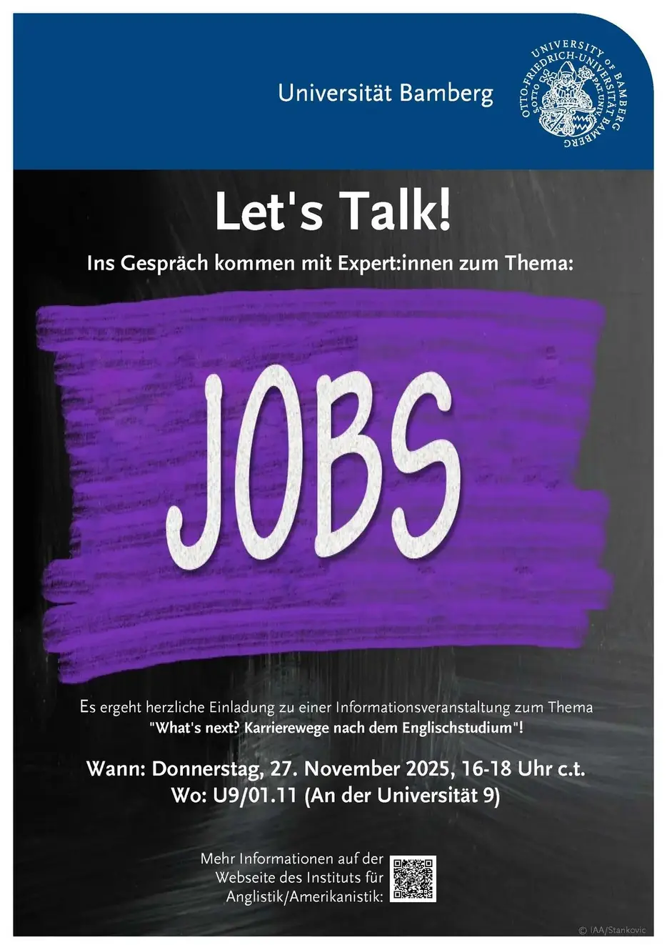 Am 27. November 2025 lud das Institut für Anglistik/Amerikanistik zum Expert:innengespräch zum Thema “Karrierewege nach dem Studium (Teil 2)”.