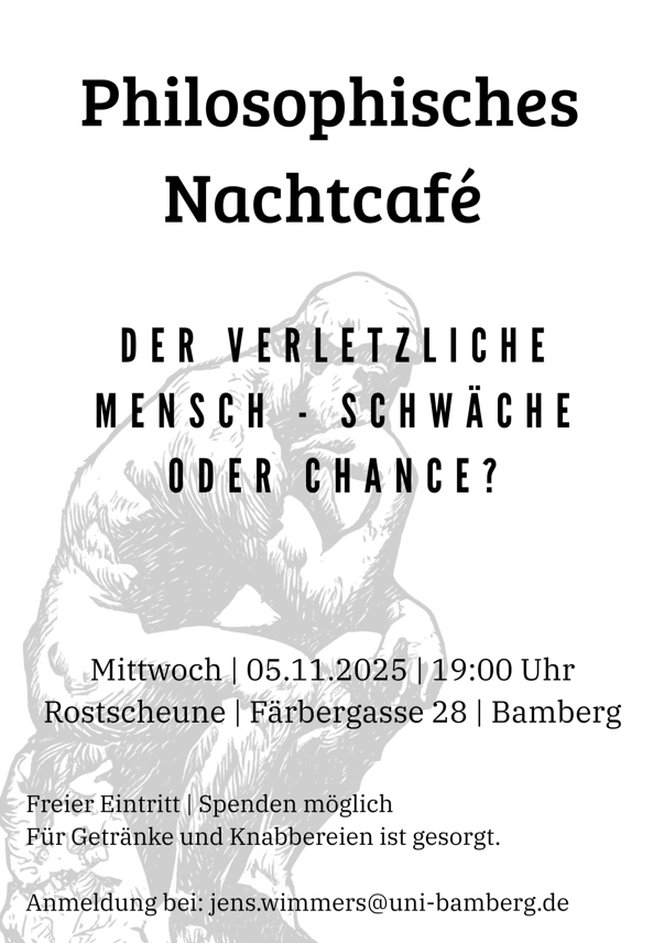 | 05.11.25 | Philosophisches Nachtcafé: “Der verletzliche Mensch - Schwäche oder Chance?”(182.6 KB) | 19:00 Uhr | Färbergasse 28 (Rostscheune) |
