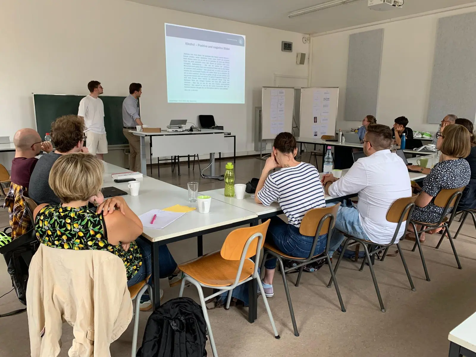 Dass dem auch in der Antike so war, zeigte dann auch gleich der erste Input-Vortrag aus der Alten Geschichte. Lukas Goller und Johannes Röder verglichen als Einstieg das griechische Symposion mit dem römischen convivium. Bei einem allgemeineren Teil über den Verlauf eines antiken Abends der aristokratischen Oberschicht mit Genuss von Wein, Musik und Tanz zeigten sich besonders auch die ritualisierten und religiösen Ausdrucksformen sowie sozialhistorische Aspekte. Konnten doch antike Gastmähler – wie in heutiger Zeit – auch zur Repräsentation, Distinktion und ‚Networking‘ genutzt werden. Daraufhin entstand ein angeregter Austausch zu etwaigen Parallelen moderner WG-Feiern, der mit der Recherche zum Alkoholgehalt antiken Weins endete.