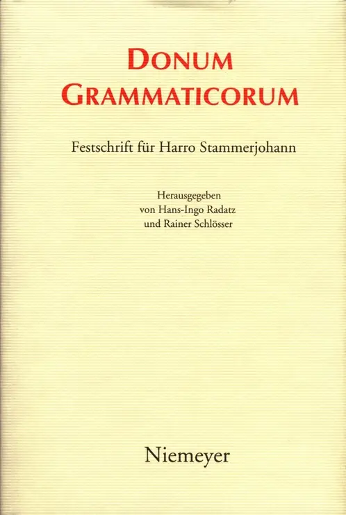 Donum grammaticorum – FS Harro Stammerjohann, hrsg. von Hans-Ingo Radatz und Rainer Schlösser, Tübingen: Niemeyer, 2003, ISBN: 3-484-50712-8. [Rezensionen: Rez. von Anja Overbeck in: Romanistik in Geschichte und Gegenwart 10:1, 95-98. Rez. von Eduardo Blasco Ferrer in: ZrPh 121 (2005), Heft 4, 718-721.]