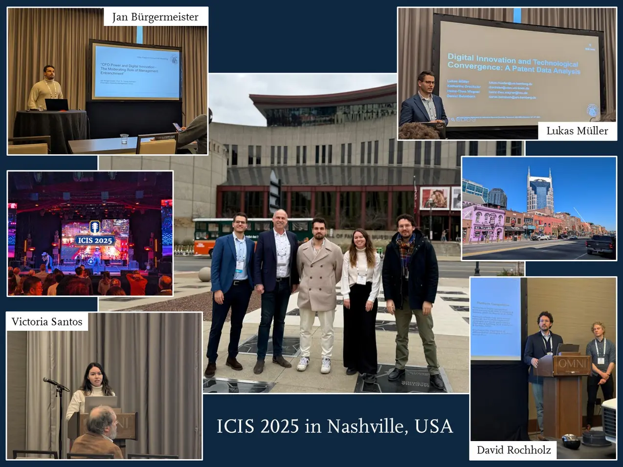 Unser Team der Forschungsgruppe Informationssystemmanagement der Universität Bamberg reiste zur ICIS nach Nashville, um dort einige unserer Forschungsergebnisse zu präsentieren. Unser jüngstes Teammitglied, Jan Bürgermeister, stellte eine neue Forschungsidee zur Rolle von Finanzvorständen und der Verankerung von Führungspositionen für die digitale Innovationsleistung von Unternehmen vor. Victoria Santos präsentierte eine Studie zur Bewertung verschiedener KI-Kategorien auf Basis von Patentanalysen. Lukas Müller analysierte ebenfalls Patente und zeigte auf, wo digitale Innovation zu technologischer Konvergenz führt. Beide Studien liefern wichtige Erkenntnisse für die Bewertung und das Management strategischer Technologieportfolios. Und schließlich nahm David Rochholz am Paper-A-Thon teil, den sein Team mit einer Arbeit zum Thema „Wettbewerbsauswirkungen der KI-Versionierung“ gewann. Herzlichen Glückwunsch!