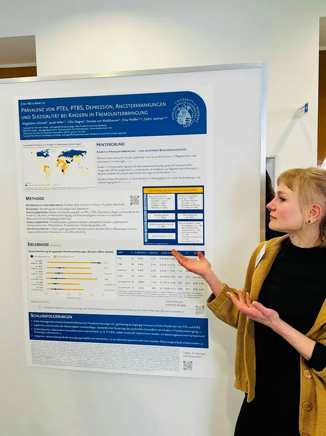 Zu unserer großen Freude gewann Magdalena Schmoll mit ihrem Poster „Prävalenz von potenziell traumatischen Ereignissen, PTBS, Depressionen, Ängsten und Suizidalität bei Kindern in Fremdunterbringung: Eine Meta-Analyse“ den Posterpreis auf der DeGPT 2026.