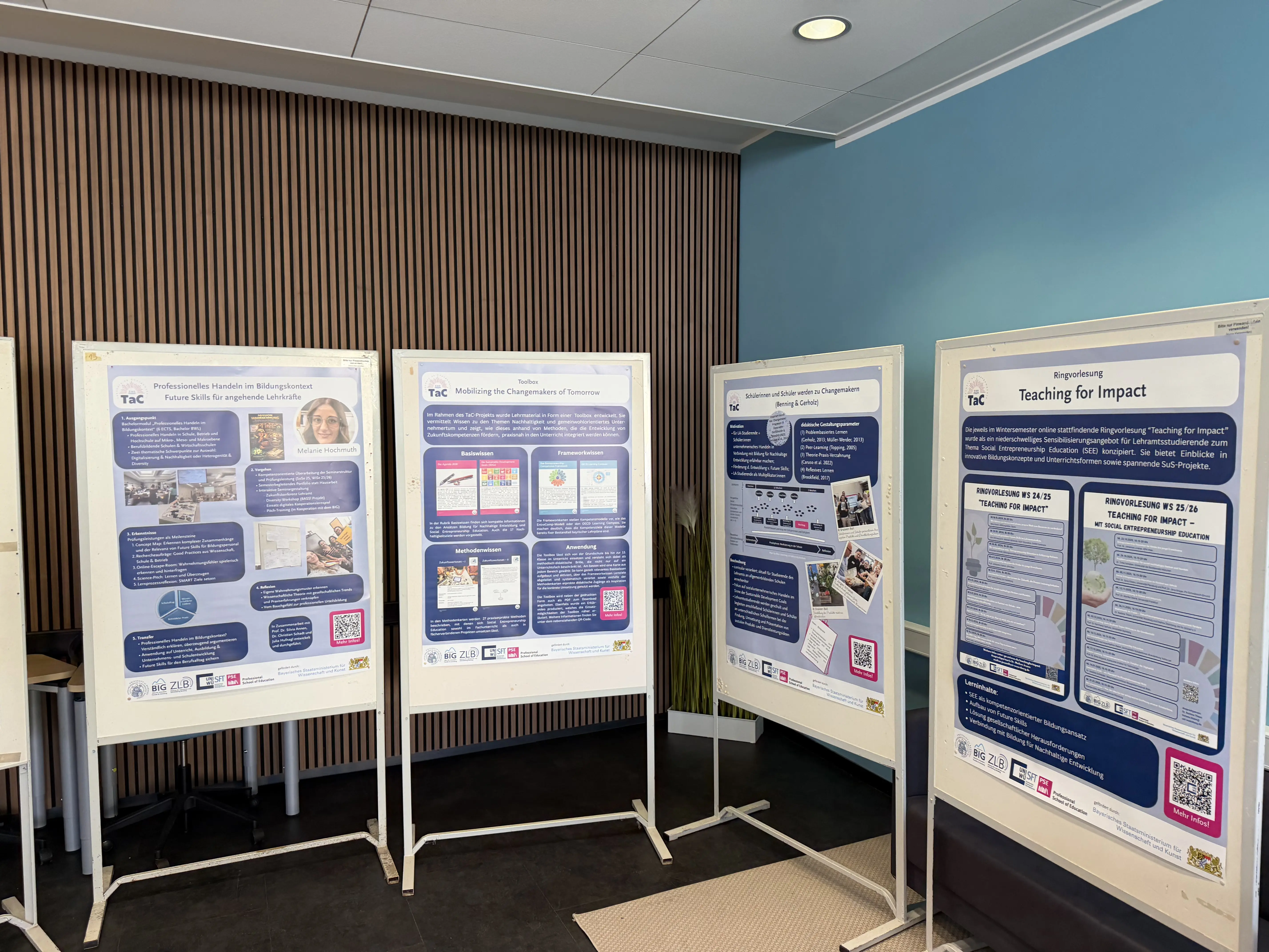 Ein Höhepunkt der Veranstaltung war der “Markt der Möglichkeiten”, bei dem Projekte, Lehrformate und Transferprodukte in Posterpräsentationen vorgestellt wurden. Sichtbar wurde die Bandbreite der entwickelten Konzepte – von innovativen Seminaren und Ringvorlesungen über Wettbewerbsformate bis hin zur TaC-Toolbox, die Lehrkräften aller Schularten konkrete methodisch-didaktische Zugänge eröffnet. Der intensive Austausch eröffnete neue Perspektiven und setzte Impulse, die über die bisherigen Projektkontexte hinausweisen und in künftige Vorhaben der Lehrkräftebildung einfließen können.