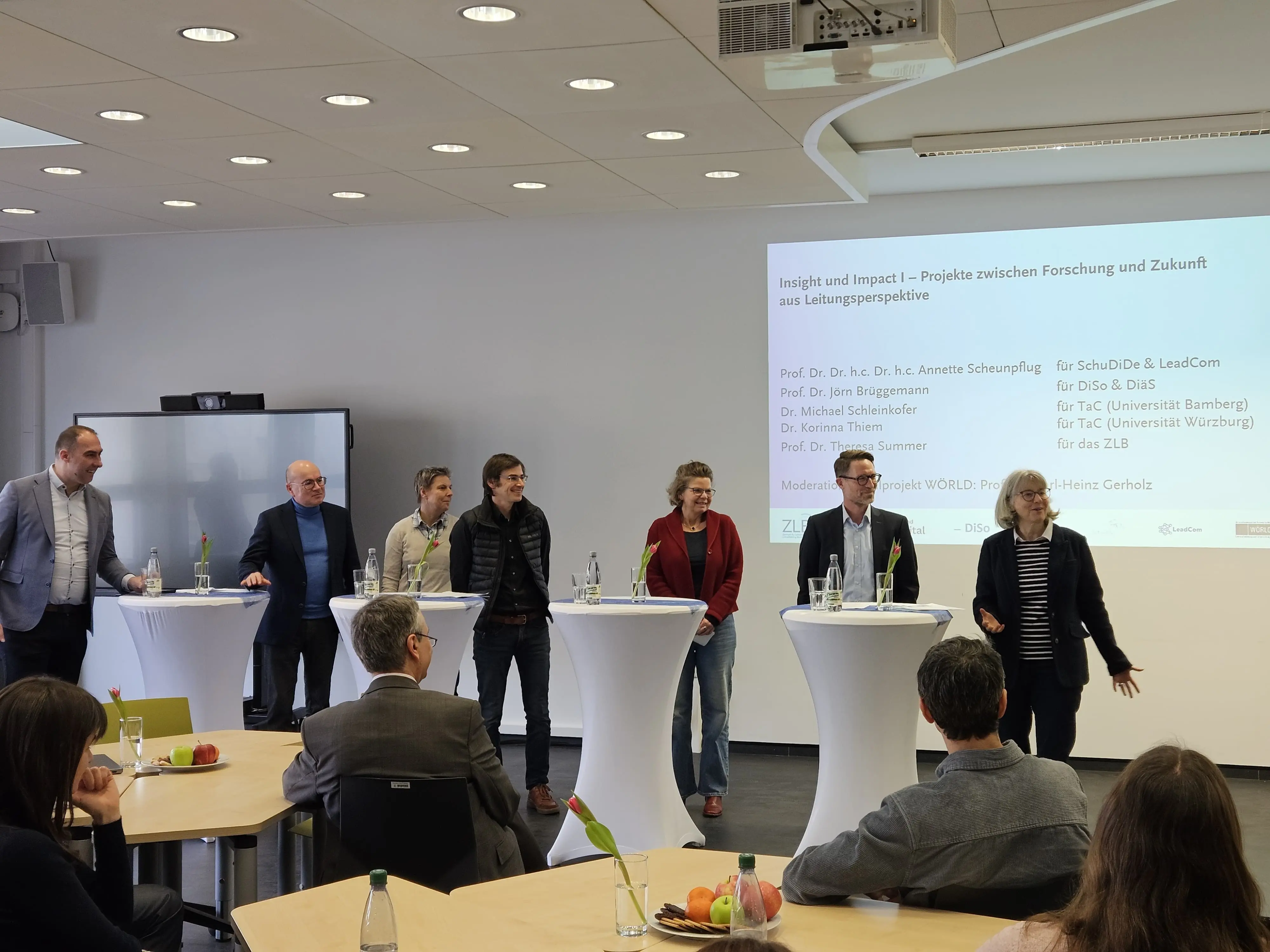 Im Programmpunkt “Insight & Impact” gaben die Projektleitungen im Rahmen eines Podiumsgesprächs Einblicke in Entwicklungsverläufe, Herausforderungen und Meilensteine der vergangenen Jahre. Deutlich wurde dabei, wie sehr beide Verbünde von der engen Zusammenarbeit zwischen Bamberg und Würzburg profitiert haben. Während lernen:digital mit den fünf Projektverbünden DiSo, DiäS, LeadCom, SchuDiDe und WÖRLD die Entwicklung und Evaluation forschungsbasierter Fortbildungsmodule zur Förderung digitaler Handlungskompetenzen vorantrieb, setzte TaC mit Social Entrepreneurship Education (SEE) gezielt Impulse für eine zukunftsorientierte und gesellschaftlich verantwortungsbewusste Schulentwicklung.