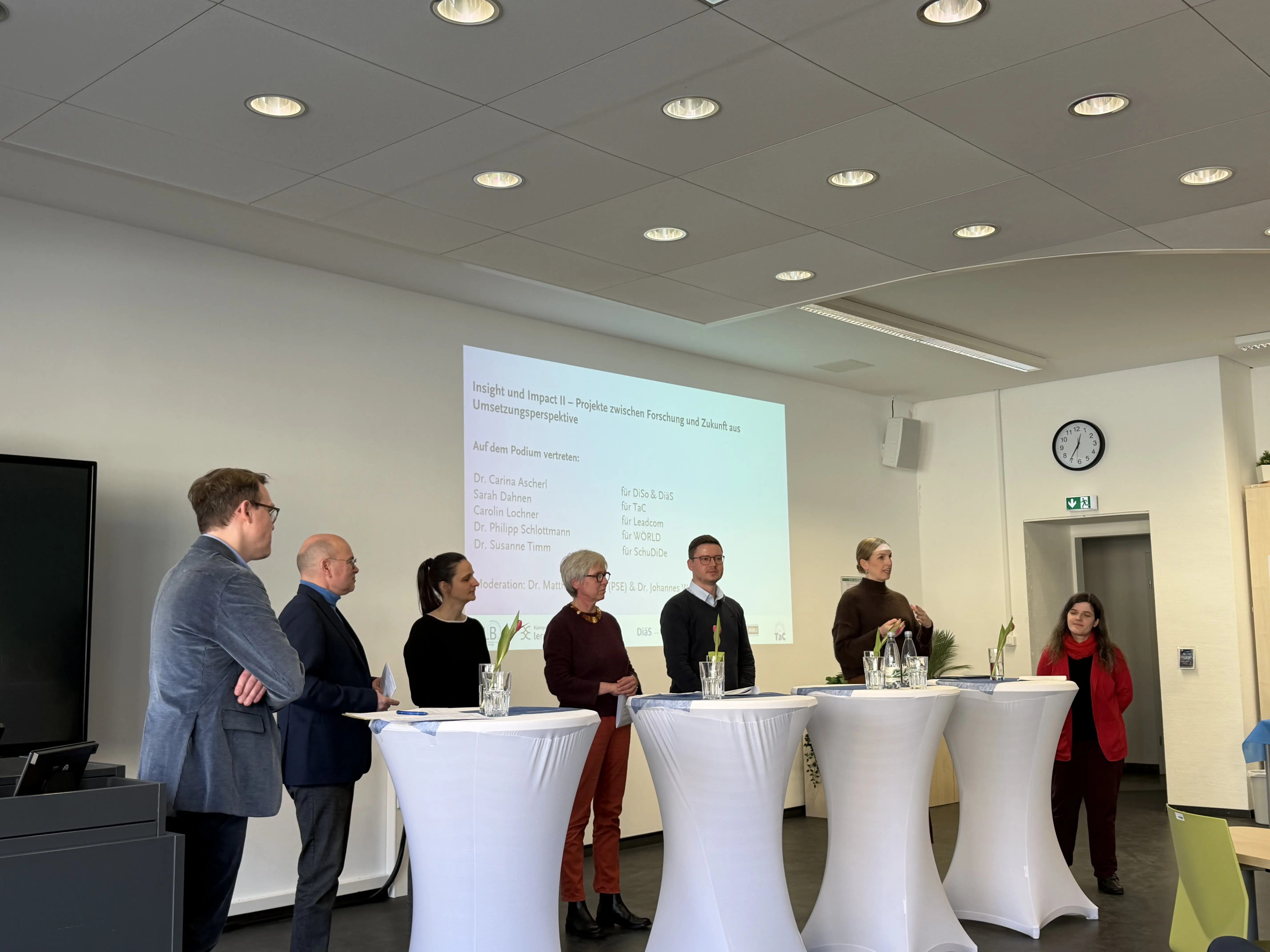 Im Rahmen eines zweiten Podiumsgesprächs reflektierten Mitarbeitende aus den Projekten die Umsetzungsperspektive. Im Mittelpunkt standen Fragen der nachhaltigen Verankerung, der Skalierbarkeit sowie der strukturellen Einbettung in bestehende Studien- und Fortbildungsangebote. Deutlich wurde: Innovation in der Lehrkräftebildung besteht nicht allein in neuen Formaten, sondern in der systematischen Verbindung von wissenschaftlicher Fundierung, schulischer Praxisnähe und institutioneller Unterstützung. Allerdings wurden auch die Herausforderungen der kurzen Projektlaufzeiten im Kompetenzverbund lernen:digital thematisiert, was einen umfassenden Transfer nicht immer einfach machte.