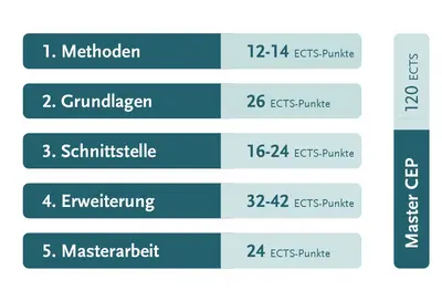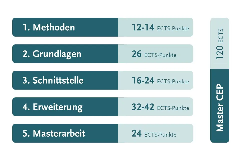 Nachfolgend finden Sie eine Übersicht der Pflicht- und Wahlmodule der jeweiligen Modulgruppen. Details zu den einzelnen Lehrveranstaltungen liefert Ihnen das Modulhandbuch CEP.