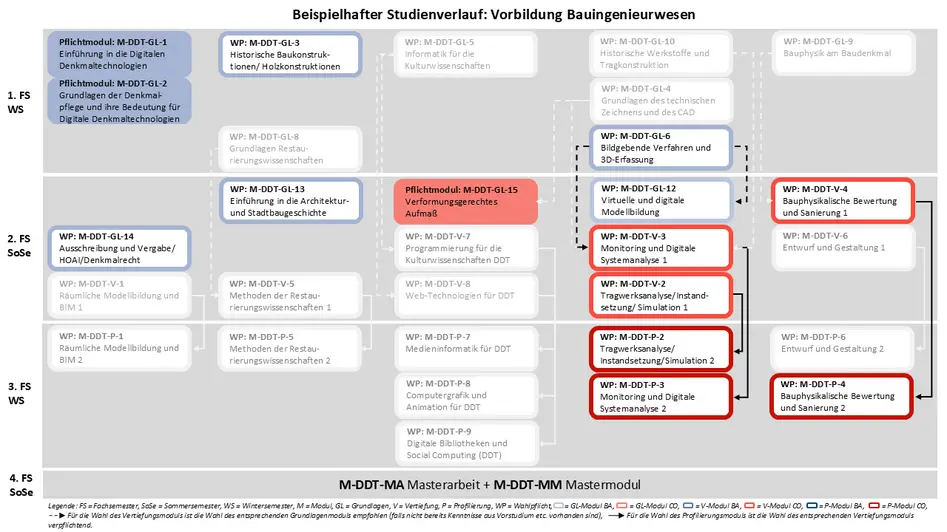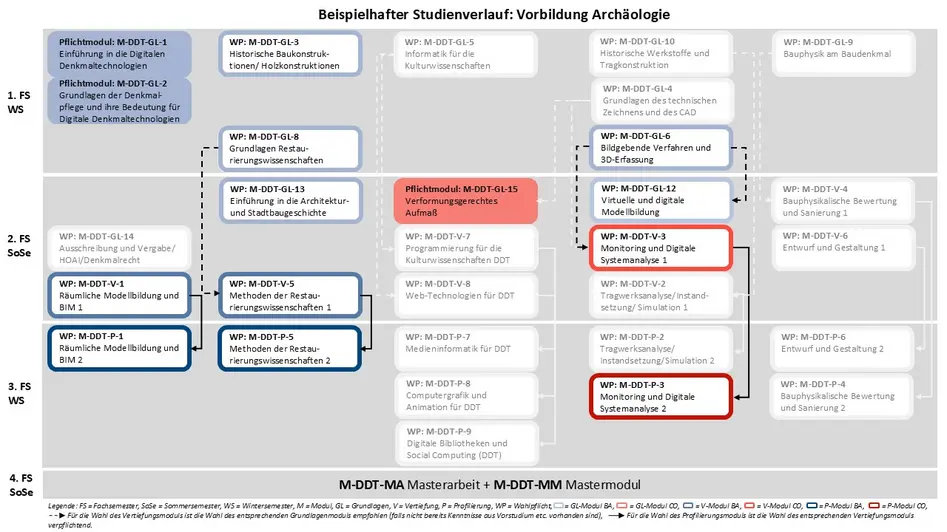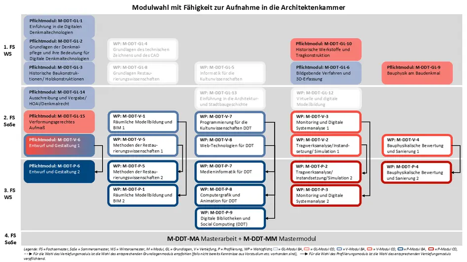 Die Module M-DDT-GL-1Einführung in die Digitale Denkmaltechnologien, M-DDT-GL-2Grundlagen und Theorien der Denkmalpflege und ihre Bedeutung für die Digitalen Denkmaltechnologien und M-DDT-GL-15 Verformungsgerechtes Aufmaß sind Pflichtmodule, alle weiteren sind Wahlpflichtmodule. Sie dienen dazu, einen Überblick über die am Studiengang beteiligten Fächer zu gewinnen sowie Fachwissen in den für die digitalen Denkmaltechnologien konstituierenden Themen zu erwerben.