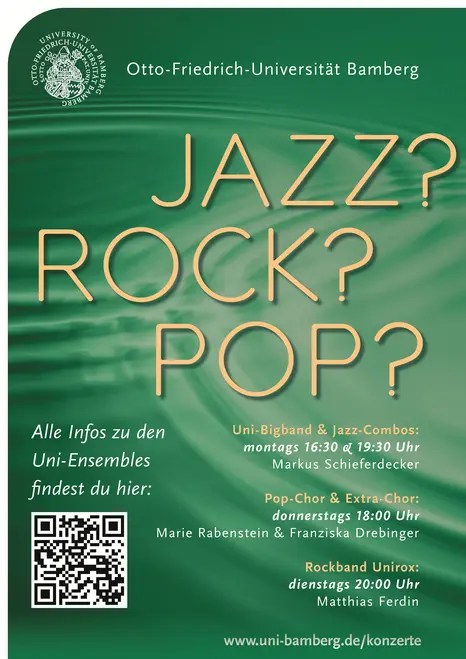 Proben: Mittwochs 18:15 - 21:00 Uhr im Musiksaal WE5 0.033, An der Weberei 5, 96047 Bamberg