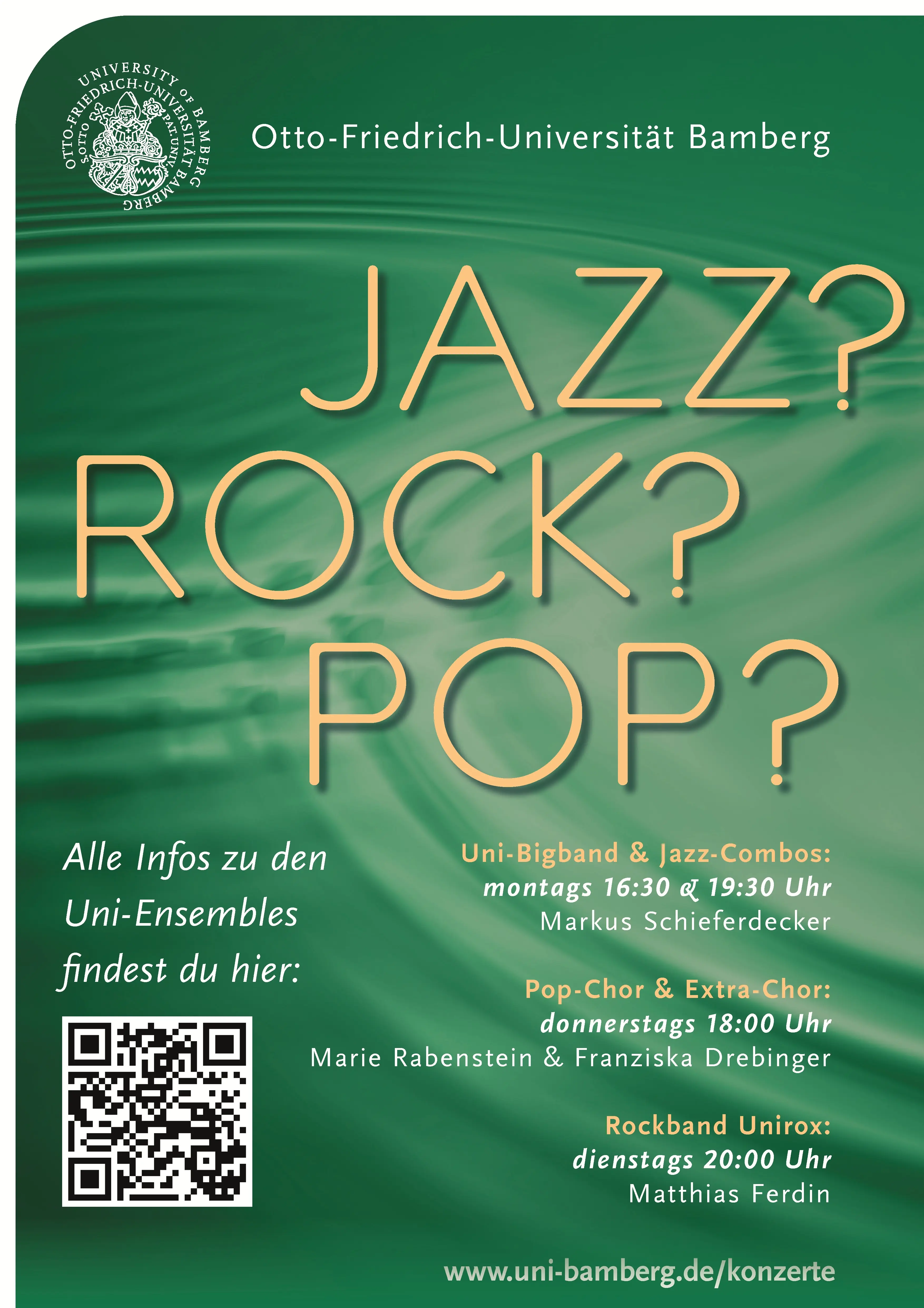 Im Wintersemester 23/24 schlägt die Geburtsstunde des neuen Pop-Chors an der Uni Bamberg! Unter der Leitung von Marie Rabenstein (HfM Würzburg) werden verschiedene Popchorarrangements sowohl acapella als auch mit Combo erarbeitet und in Doppelkonzerten mit dem Jazz- und Popchor der HfM Würzburg (watch here) aufgeführt werden!
