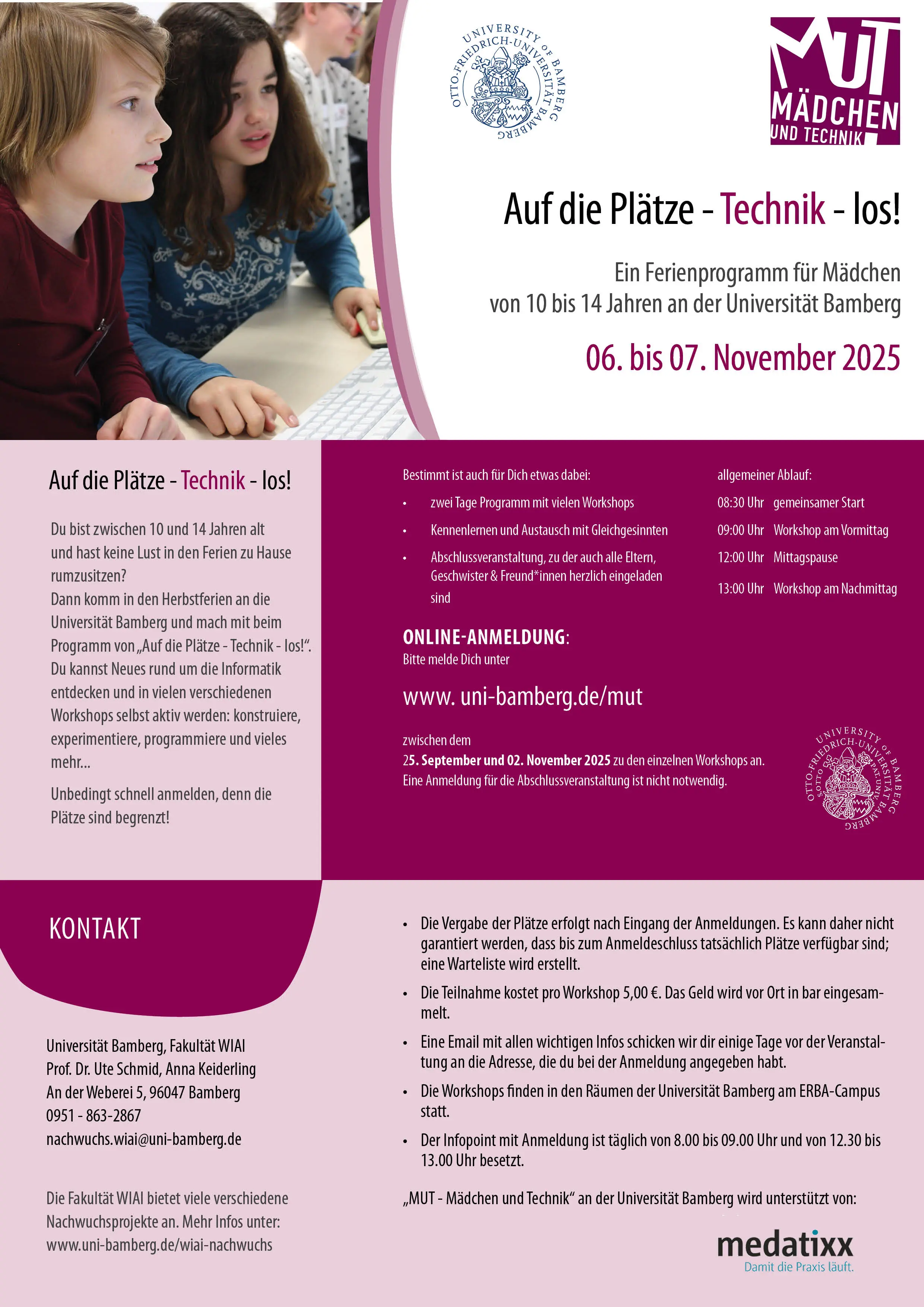 In den Herbstferien 2005 fand die Aktion "Auf die Plätze - Technik - Los!" erstmalig an der Fakultät Wirtschaftsinformatik und Angewandte Informatik (WIAI) der Uni Bamberg statt. Inzwischen ist MUT an der Universität Bamberg zu einer festen Institution geworden. Dabei sind die Workshops regelmäßig ausgebucht und und viele Teilnehmerinnen kommen über mehrere Jahre wieder.