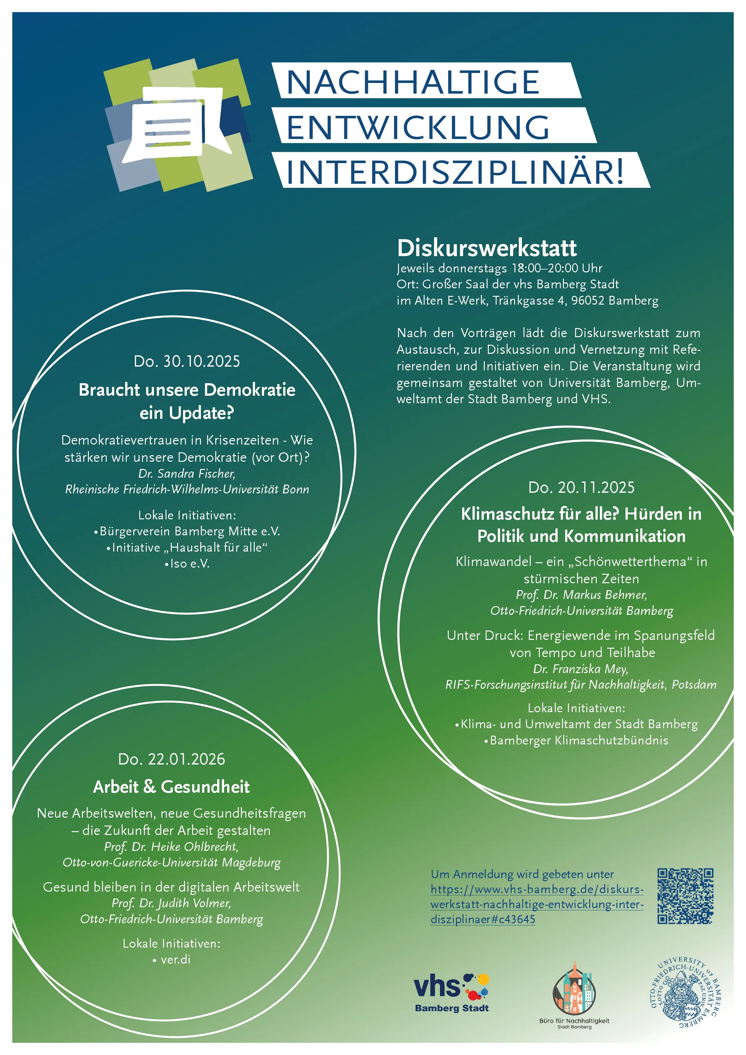 - @Studierende, die die Diskurswerkstatt als Teil des Bildungszertifikats Nachhaltige Entwicklung oder des BNE-Schwerpunkts belegen: Neben den drei öffentlichen Terminen gibt es weitere Termine bereits ab Oktober, siehe UnivIS-Eintrag.