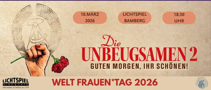 Die Gleichstellungsbeauftragten Wissenschaft der Fakultäten Wirtschaftsinformatik und Angewandte Informatik, Humanwissenschaften, Sozial- und Wirtschaftswissenschaften und Geistes- und Kulturwissenschaften sowie die Universitätsgleichstellungsbeauftragte Wissenschaft laden am 10.03.2026 um18:30 Uhr zur Filmvorführung von „DIE UNBEUGSAMEN 2 – GUTEN MORGEN, IHR SCHÖNEN!“ im Lichtspiel Bamberg ein. Im Anschluss gibt es Gelegenheit zu Diskussion und Austausch in der Scheinbar des Lichtspielkinos.