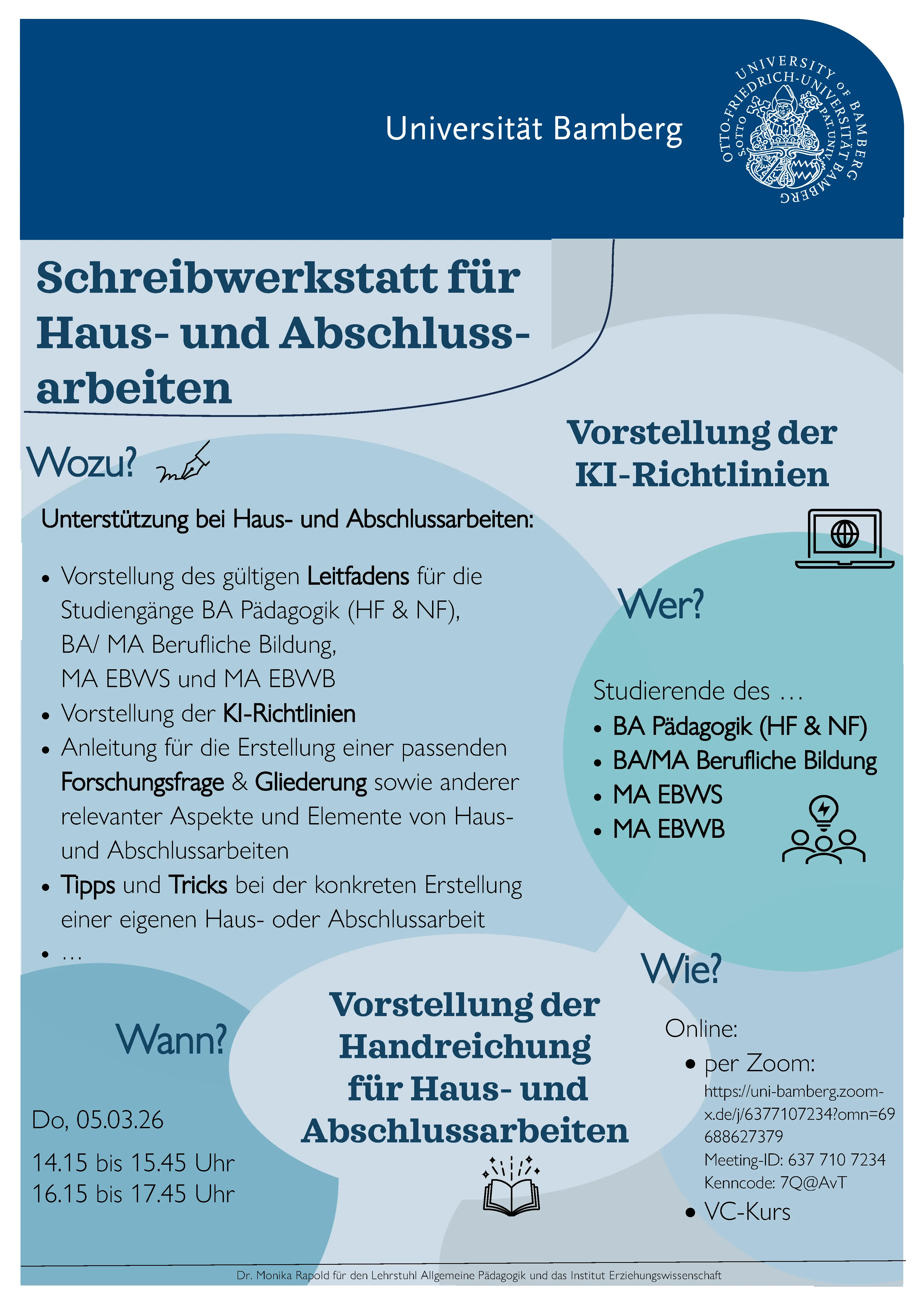 Sie sind herzlich dazu eingeladen, um sich für Ihre Hausarbeit oder Abschlussarbeit anleiten und unterstützen zu lassen. Die Schreibwerkstatt findet am 5.3.26 von 14:15 bis 15:45 und 16:15 bis 17:45 Uhr über Zoom statt.