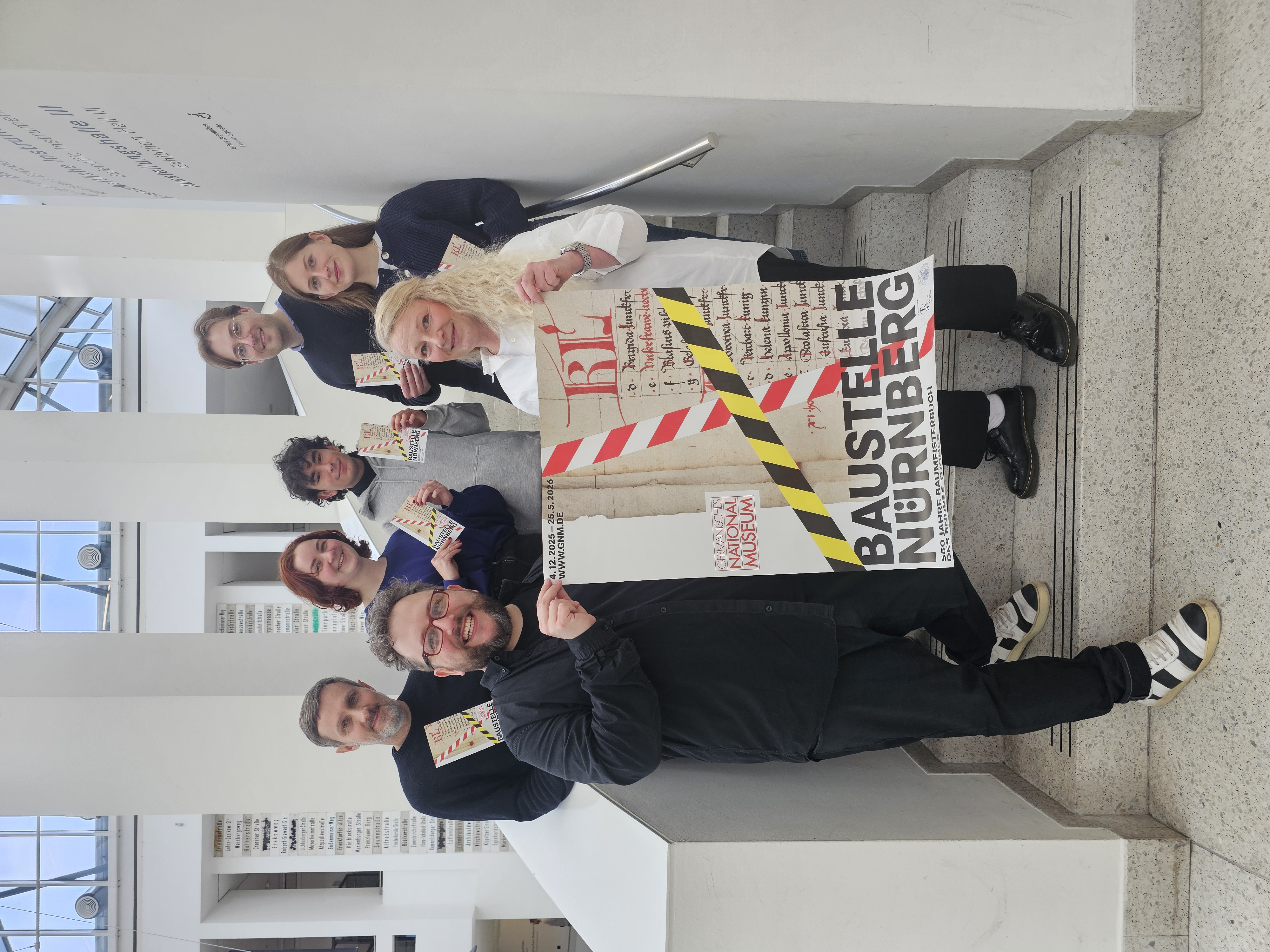 Studierende der Universität Bamberg sowie die Kuratoren Andreas Huth und Florian Abe im Foyer des Germanischen Nationalmuseums. Dort bereiteten die Studierenden ihre thematischen Führungen vor und übten sie an den Originalexponaten der Ausstellung „Baustelle Nürnberg“.
