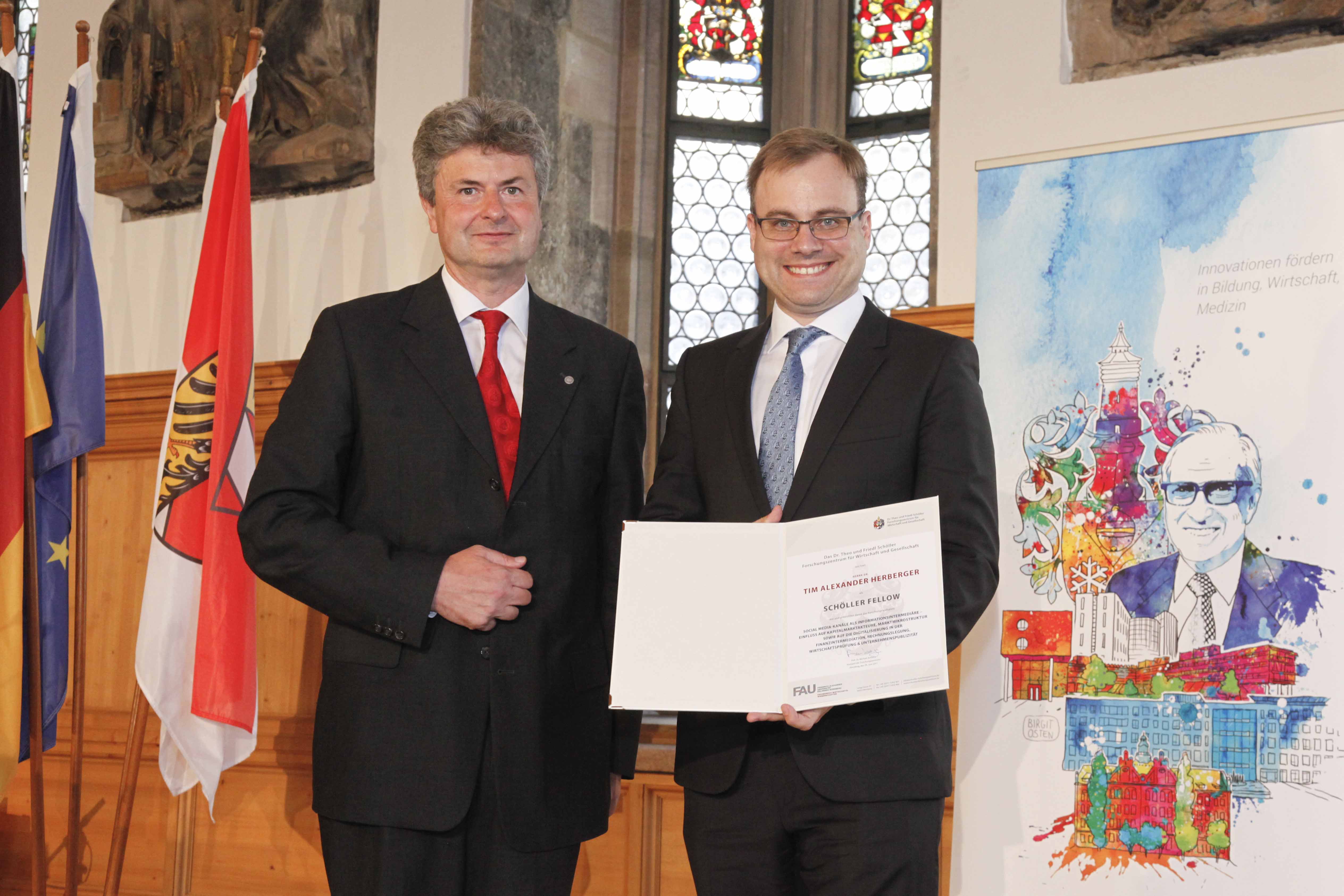 Foto „Amberg_Herberger“(518.0 KB): Der Vorstand des Schöller Forschungszentrums Michael Amberg (links) zeichnet Tim Alexander Herberger mit dem Schöller-Junior-Fellowship aus.