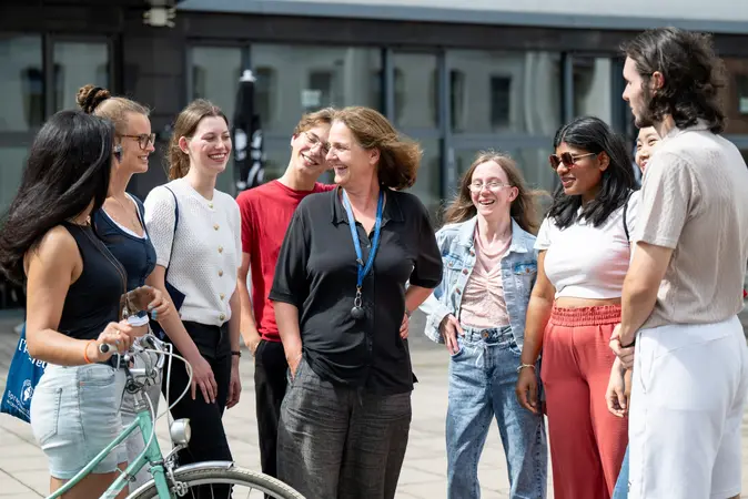 Bild „Ute Schmid_Studierende(1.7 MB)“: Ute Schmid macht KI verständlich – hier auf dem Campus der Universität Bamberg im Gespräch mit Studierenden.