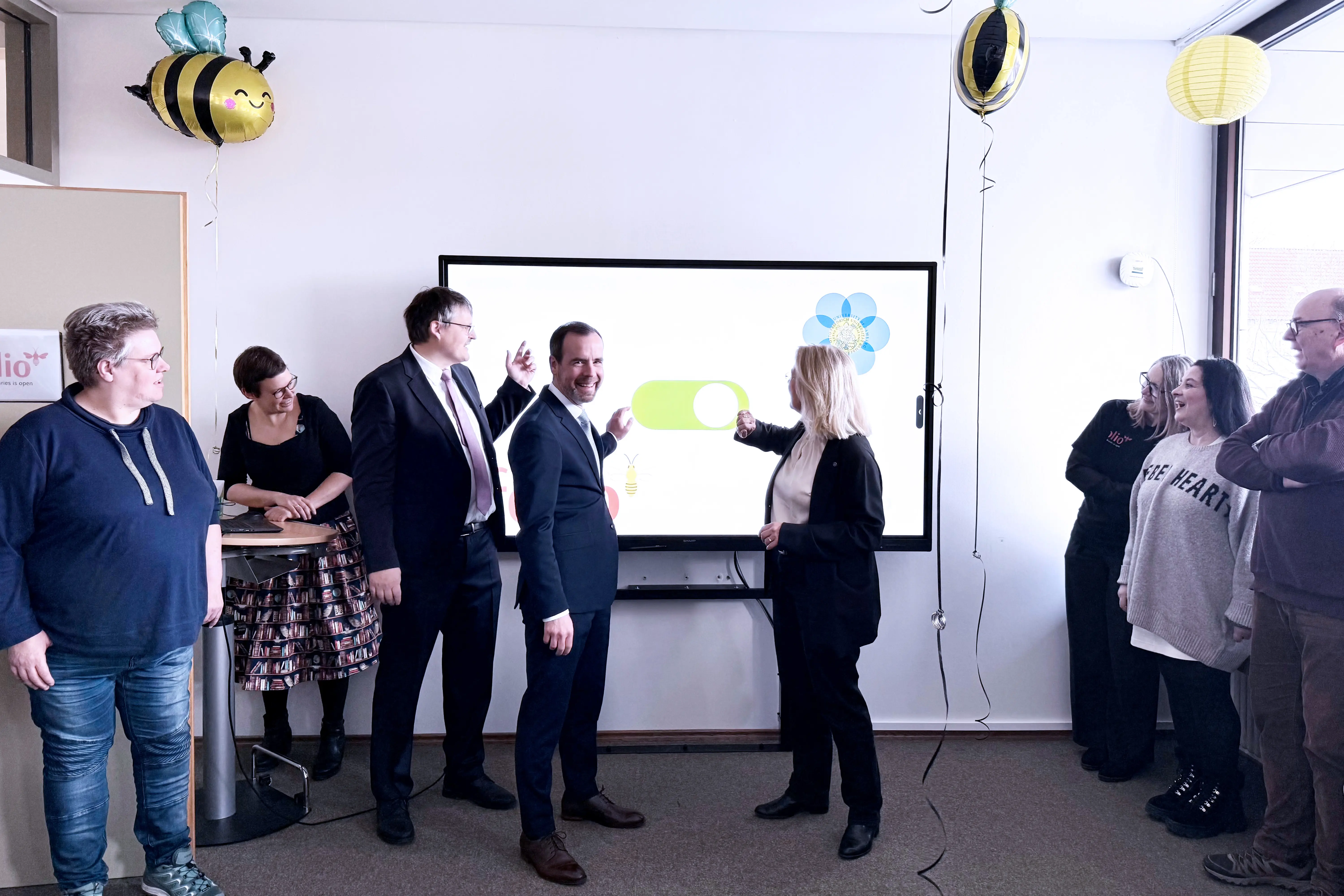 Bild „2026-02-03_FOLIO_ (1)(3.9 MB)“: Das Team der Universitätsbibliothek Bamberg gemeinsam mit Universitätspräsident Kai Fischbach und Kanzlerin Dagmar Steuer-Flieser beim offiziellen Start des neuen Managementsystems in der Teilbibliothek 3.
