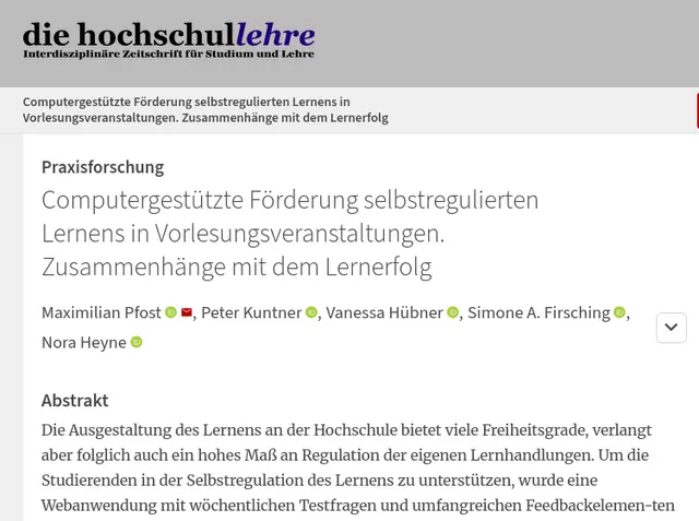 Pfost, M., Kuntner, P., Hübner, V., Firsching, S. A., & Heyne, N. (2025). Computergestützte Förderung selbstregulierten Lernens in Vorlesungsveranstaltungen. Zusammenhänge mit dem Lernerfolg. die hochschullehre, 11/2025, 752–767. https://doi.org/10.3278/HSL2557W