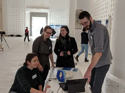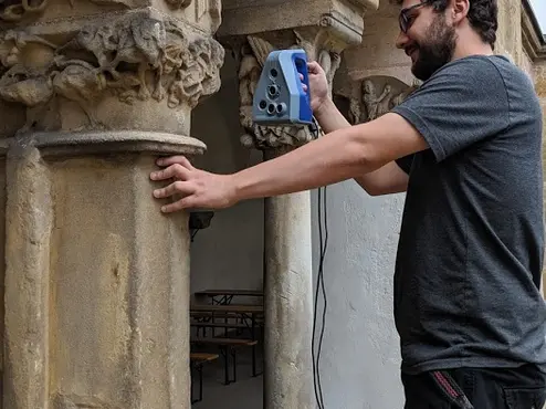 Im Juli 2019 fand die Anwendungswoche "Zerstörungsfreie restaurierungswissenschaftliche Bestandserfassung" des Masterstudiums Denkmalpflege im und um den Kreuzgang des Karmelitenklosters in Bamberg statt. Hier sehen wir einen Studierenden bei der Erfassung eines Kapitells mit einem handgeführten 3D-Scanner.