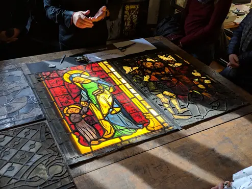 Im Februar waren Studierende im Rahmen des Seminars "Geschichte, Verwendung und Restaurierung von Glas und Email" von Dr. Katrin Wittstadt (Fraunhofer ISC) zu Besuch in der Glaswerkstatt des Erfurter Doms. Links sehen Sie ein Glasfenster nach der Restaurierung, rechts ein Feld im Zustand vor der Restaurierung. Mittels eines Leuchttisches mit Durchlicht kann man deutlich erkennen, wie stark die Lesbarkeit der Glasfenster durch die Restaurierung zugenommen hat.