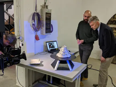 Großer Medienauflauf am KDWT. Das Bild zeigt, wie Prof. Dr. Stephan Albrecht und Max Rahrig dem Fernsehteam einen 3D-Scanner vorführt.