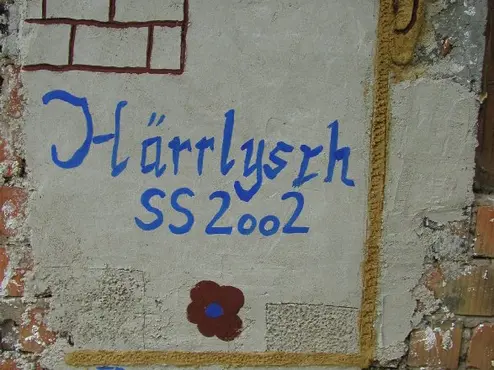 In diesem Monat ein Bild aus der Vergangenheit: Studierende des Studiengangs Denkmalpflege haben sich im Sommersemester 2002 auf dem Gelände der Firma Ibach in Malerei- und Verputztechniken geübt. Das Bild zeigt das Ergebnis der damaligen Anwendungswoche.