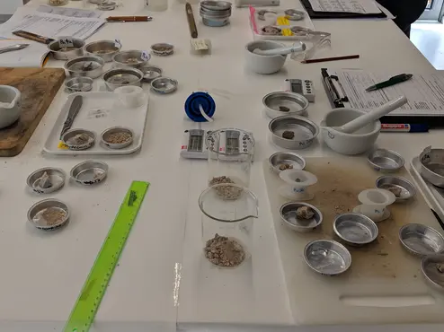 Im März 2019 hat wieder der "Mörtelkurs" der Restaurierungswissenschaften stattgefunden. 15 Studierende des Masterstudiengangs "Denkmalpflege" haben sich dort an der analytischen Untersuchung von historischen Mörteln geübt. Lehrinhalt waren u.a. das Einbetten von Mörteln in Epoxidharz oder Cyclododecan, das Erstellen von Anschliffen einer Malschicht sowie das Mikroskopieren der unterschiedlichen Proben. Weiterhin wurden nasschemische Auszüge aus den bereitgestellten Mörteln sowie eine Sieblinie erstellt.
