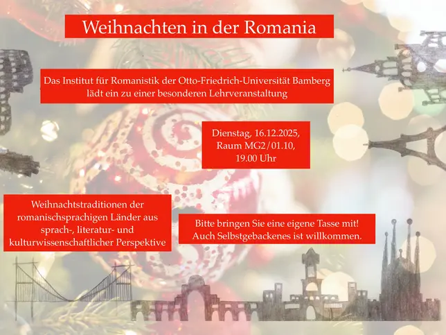 Die Romanistik ist die vergleichende Wissenschaft der romanischen Sprachen, Literaturen und Kulturen. Das Profil der Bamberger Romanistik ist kultur-, literatur- und sprachvergleichend, interdisziplinär und international ausgerichtet. Studierbar sind derzeit die Sprachen Französisch, Italienisch und Spanisch. Im CHE-Ranking 2025 belegte die Bamberger vor allem im Bereichen Betreuung und Unterstützung Spitzenpositionen.
