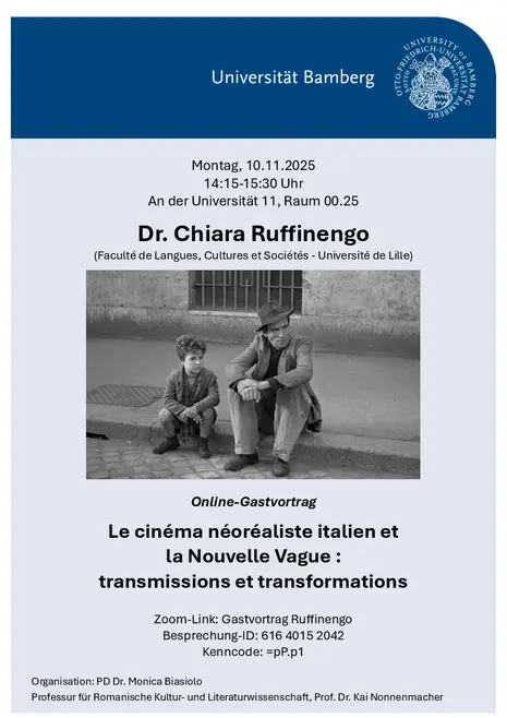 - 10.11. 2025, Gastvortrag zum Thema Le cinéma neoréaliste italien et la Nouvelle Vague: transmissions et transformations, Vortragende: Dr. Chiara Ruffinengo, Faculté de Langues, Cultures et Sociétés - Université de Lille