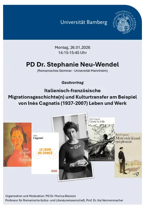 - 19.01.2026, Gastvortrag zum Thema Italienisch-französische Migrationsgeschichte(n) und Kulturtransfer am Beispiel von Inès Cagnatis (1937-2007) Leben und Werk, Vortragende: PD Dr. Stephanie Neu-Wendel, Romanisches Seminar - Universität Mannheim
