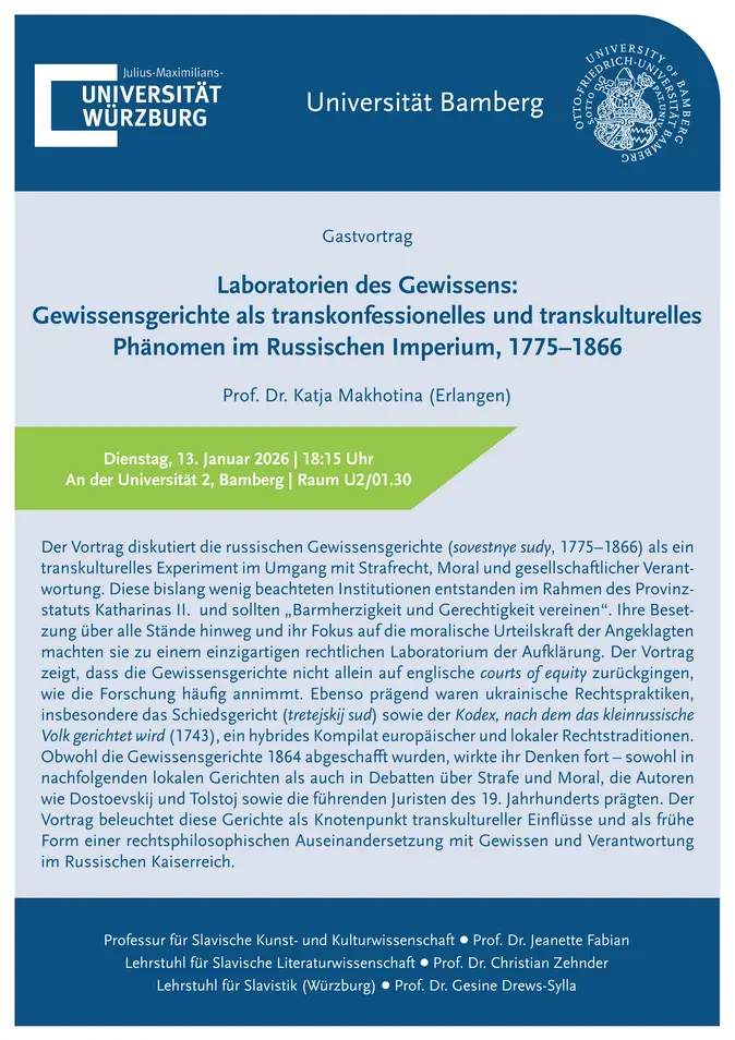 nachfolgenden lokalen Gerichten als auch in Debatten über Strafe und Moral, die Autoren wie Dostoevskij und Tolstoj sowie die führenden Juristen des 19. Jahrhunderts prägten. Der Vortrag beleuchtet diese Gerichte als Knotenpunkt transkultureller Einflüsse und als frühe Form einer rechtsphilosophischen Auseinandersetzung mit Gewissen und Verantwortung im Russischen Kaiserreich.