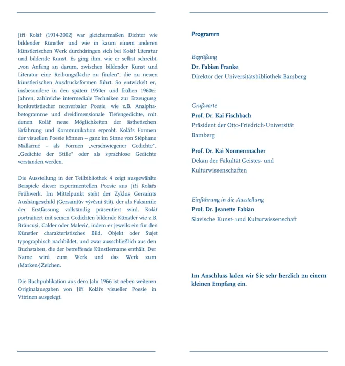 Die Ausstellung in der Teilbibliothek 4 zeigt ausgewählte Beispiele dieser experimentellen Poesie aus Jiří Kolářs Frühwerk. Im Mittelpunkt steht der Zyklus Gersaints Aushängeschild (Gersaintův vývěsní štít), der als Faksimile der Erstfassung vollständig präsentiert wird. Kolář portraitiert mit seinen Gedichten bildende Künstler wie z.B. Brâncuși, Calder oder Malevič, indem er jeweils ein für den Künstler charakteristisches Bild, Objekt oder Sujet typographisch nachbildet, und zwar ausschließlich aus den Buchstaben, die der betreffende Künstlername enthält. Der Name wird zum Werk und das Werk zum (Marken-)Zeichen.