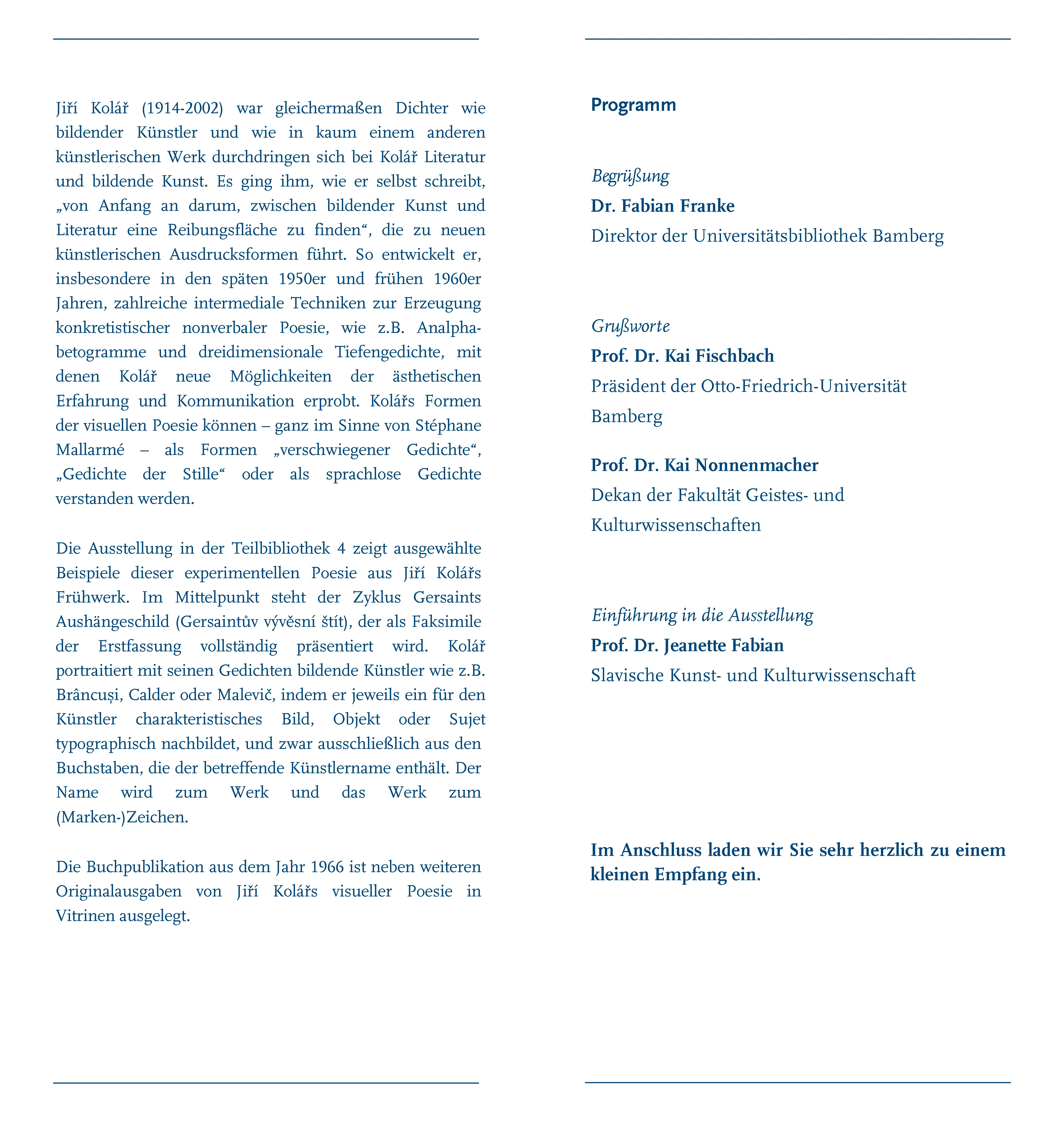 Die Ausstellung in der Teilbibliothek 4 zeigt ausgewählte Beispiele dieser experimentellen Poesie aus Jiří Kolářs Frühwerk. Im Mittelpunkt steht der Zyklus Gersaints Aushängeschild (Gersaintův vývěsní štít), der als Faksimile der Erstfassung vollständig präsentiert wird. Kolář portraitiert mit seinen Gedichten bildende Künstler wie z.B. Brâncuși, Calder oder Malevič, indem er jeweils ein für den Künstler charakteristisches Bild, Objekt oder Sujet typographisch nachbildet, und zwar ausschließlich aus den Buchstaben, die der betreffende Künstlername enthält. Der Name wird zum Werk und das Werk zum (Marken-)Zeichen.