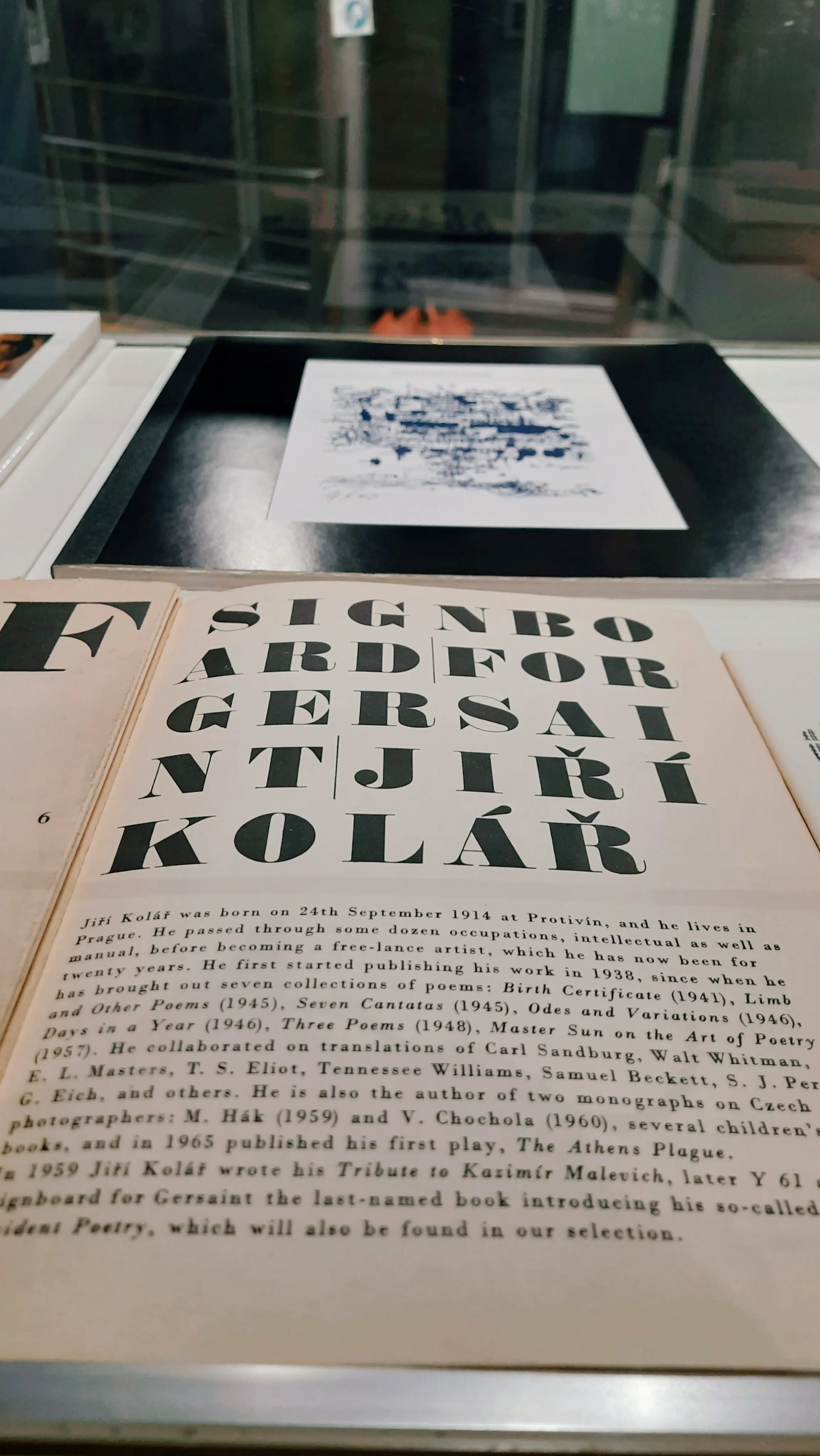 Die Ausstellung in der Teilbibliothek 4 zeigt ausgewählte Beispiele dieser experimentellen Poesie aus Jiří Kolářs Frühwerk. Im Mittelpunkt steht der Zyklus Gersaints Aushängeschild (Gersaintův vývěsní štít), der als Faksimile der Erstfassung vollständig präsentiert wird. Kolář portraitiert mit seinen Gedichten bildende Künstler wie z.B. Brâncuși, Calder oder Malevič, indem er jeweils ein für den Künstler charakteristisches Bild, Objekt oder Sujet typographisch nachbildet, und zwar ausschließlich aus den Buchstaben, die der betreffende Künstlername enthält. Der Name wird zum Werk und das Werk zum (Marken-)Zeichen.