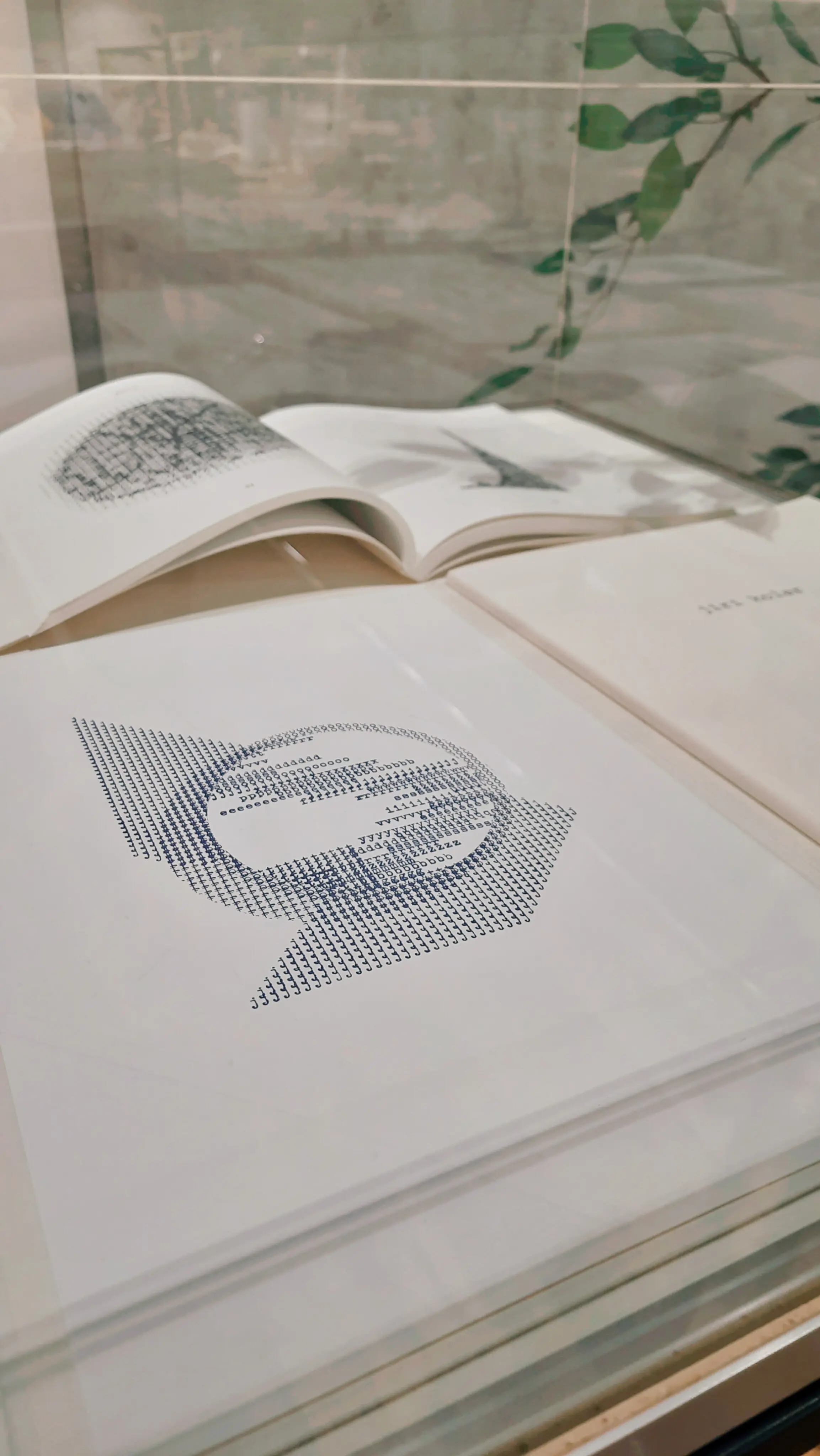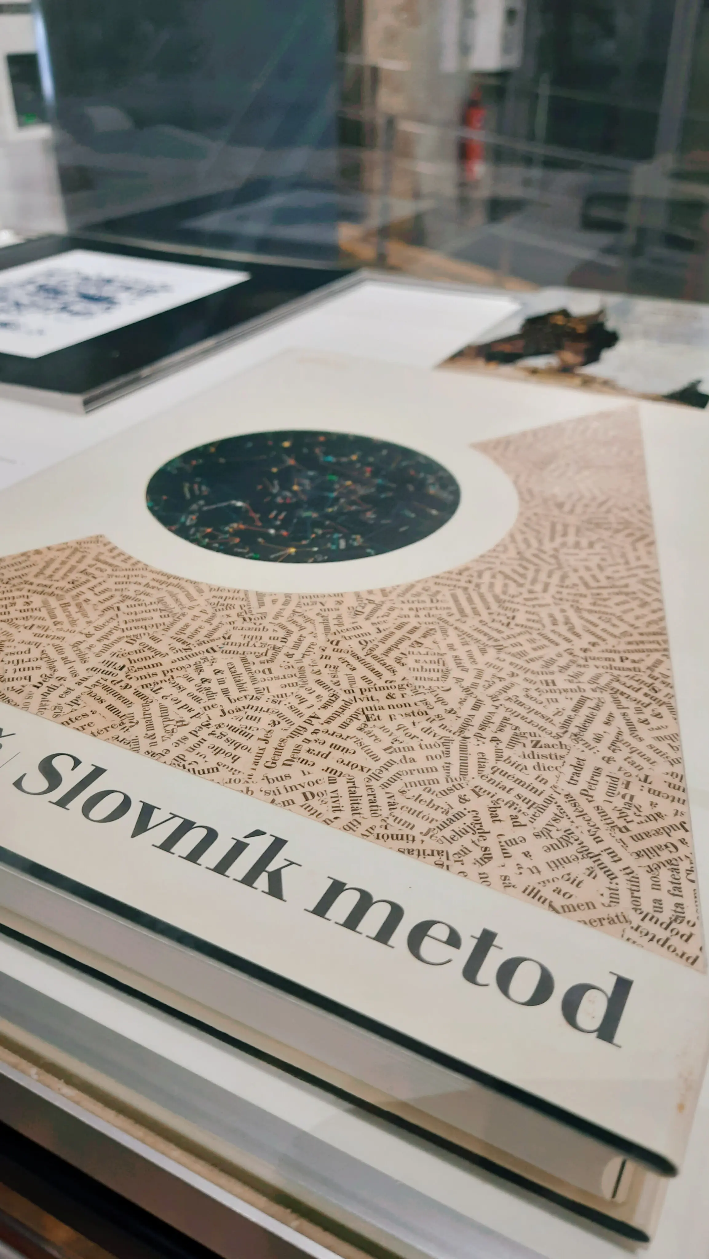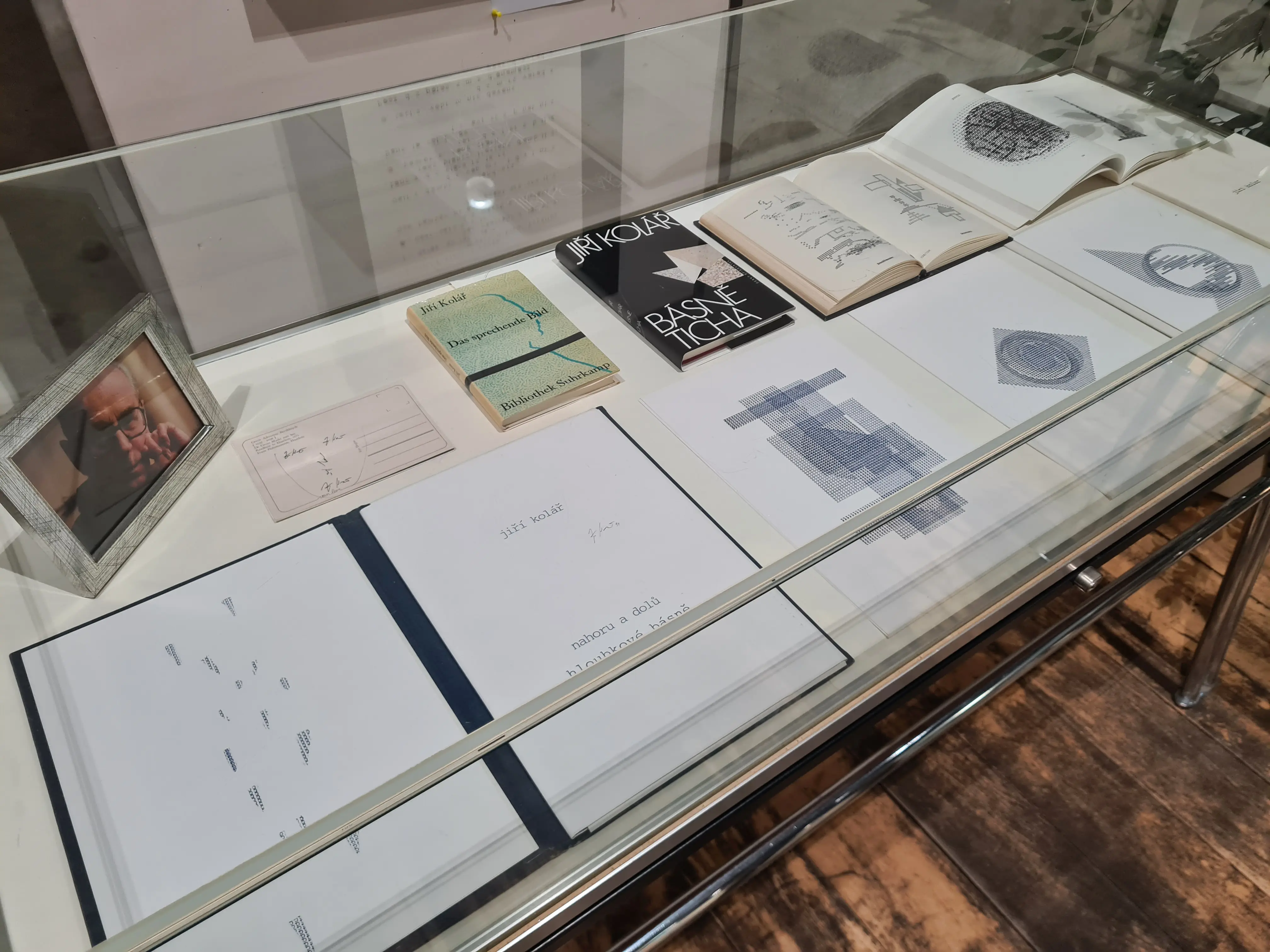 Die Buchpublikation aus dem Jahr 1966 ist neben weiteren Originalausgaben von Jiří Kolářs visueller Poesie in Vitrinen ausgelegt.