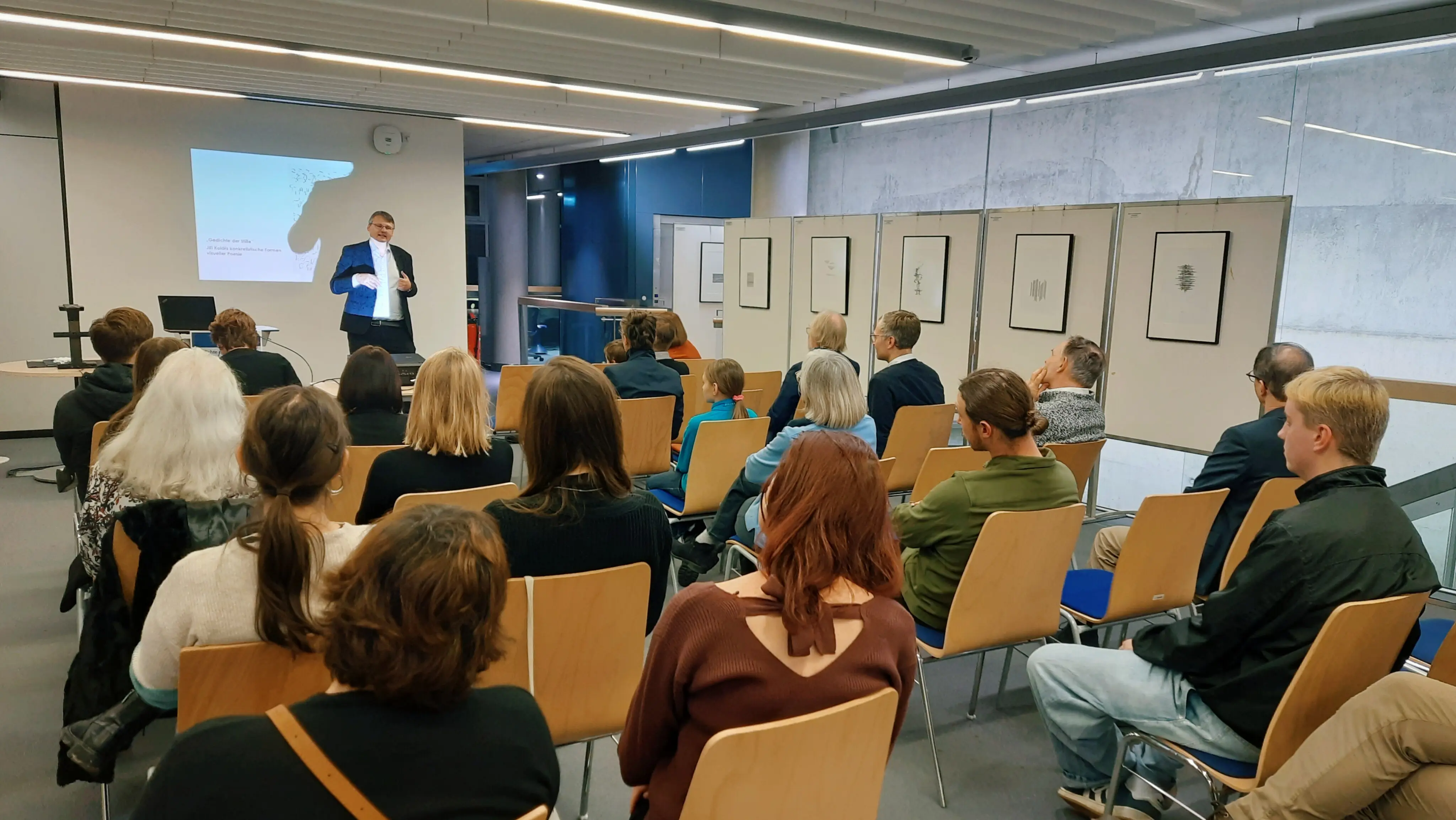 Die Professur für Slavische Kunst- und Kulturwissenschaft und die Universitätsbibliothek Bamberg veranstalteten am Mittwoch, 14.01.2026, die Eröffnung der Ausstellung "Gedichte der Stille. Jiří Kolářs konkretistische Formen visueller Poesie" in der Teilbibliothek 4.