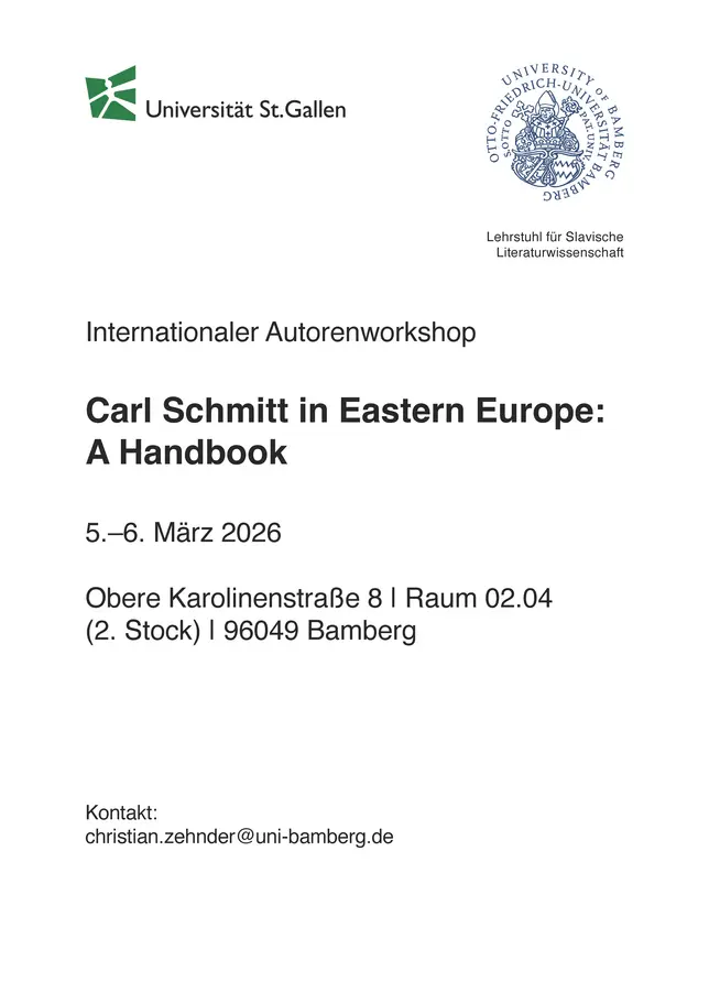News Slavische Literaturwissenschaft 18.02.2026 Workshop: Carl Schmitt in Eastern Europe 5.–6. März 2026 | OK8/02.04 22.12.2025 [Gastvortrag] Laboratorien des Gewissens: Gewissensgerichte als transkonfessionelles und transkulturelles Phänomen im Russischen Imperium, 1775–1866 Prof. Dr. Katja Makhotina (Erlangen) | Dienstag, 13. Januar 2026 | 18:15 Uhr | U2/01.30 03.11.2025 [SOG-Vortrag] „Ruski doktor“: Russische Soft Power in Serbien Jens Herlth (Fribourg) | Mittwoch, 26.11.2025 | 18.15–19.45 Uhr | U2/02.04 06.10.2025 Lehrveranstaltungsangebot im Wintersemester 2025/26 30.06.2025 [PODIUMSDISKUSSION] Serbien am Scheideweg: Studentenproteste und Ihre Folgen 16. Juli 2025 | 18:00 Uhr s.t. | Markusstraße 8a | Raum MG2/01.10 11.06.2025 Antrittsvorlesung Prof. Dr. Christian Zehnder 1. Juli 2025 | 18.15 Uhr | An der Universität 2 (U2) | Hörsaal U2/00.25 | 96047 BambergJens Heinrich 27.05.2025 [Exkursion] Verflechtungen polnischer, deutschsprachiger und jüdischer Kulturen in Südwestpolen (11.–16. Mai 2025) Prof. Dr. Iris Hermann (Germanistik), Prof. Dr. Christian Zehnder (Christian Zehnder) 08.05.2025 [GASTVORTRAG] Ars moriendi im Sozialismus. Der Topos des „guten Todes“ in der ungarischen Literatur, 1960–1980 PD Dr. Heléna Tóth (Göttingen) | Dienstag, 27. Mai 2025 | 18.15–19.45 Uhr | U2/02.04 17.04.2025 [Guest Lecture] You Crucify Freedom, but… the Mind Is Indomitable: The Pragmatics of Yulii Rybakov’s and Oleg Volkov’s Artistic Action of 1976 Dr. Dmitrii Bresler (independent researcher) | Wednesday, Mai 7, 2025 | 14:15 (CET) | OK8/02.04 12.12.2024 Maxim Ossipow zu Gast in Bamberg: Literarische Lesung und Poetikvorlesung 29. Januar 2025, 19 Uhr und 30. Januar 2025, 10.15 Uhr Am Kranen 12, Raum KR12/02.18, 96047 Bamberg und Obere Karolinenstraße 8, Raum OK8/01.03,… 09.12.2024 [GASTVORTRAG] Kafkas Verwandlung: Scheidewege des europäischen Symbolismus PATRICK FLACK (Fribourg) | Mittwoch, 22. Januar 2025 | 14.15–15.45 Uhr | OK8/02.04 12.11.2024 Workshop and Poetry Reading: Eugene Ostashevsky (New York University) in Bamberg (3./4.12.2024) 11.11.2024 Ukrainische Literatur in der Universitätsbibliothek Vortrag und Buchübergabe am Dienstag, 12. November 2024, 19 Uhr in der Teilbibliothek 4 Arkady Kruglov 01.07.2024 Bericht zur Tagung „Ideengeschichte und Ideenpolitik der Säkularisierung in der russischen und sowjetischen Kulturgeschichte“ Bamberg, 13.–15. Juni 2024 Hanno Teske 01.07.2024 [EXKURSION] Zwischen Romantik und Kapitalismus. Auf den Spuren von Bolesław Prus’ Roman Die Puppe in Warschau und Łódź Sommersemester 2024, 5.–10. Mai 2024 08.04.2024 [GASTVORTRAG] Dmytro Čyževs‘kyj: Die letzte Geschichte der slavischen Literaturen, vergleichend und subversive TOMÁŠ GLANC (Zürich) | Dienstag, 25. Juni 2024 | 14.15–15.45 Uhr | OK8/01.26 07.04.2024 [INTERNATIONALE KONFERENZ] Ideengeschichte und Ideenpolitik der Säkularisierung in der russischen und sowjetischen Kulturgeschichte 13.–15. Juni 2024 | Obere Karolinenstraße 8 | Raum 02.04 05.04.2024 [GASTVORTRAG] Metaphern der Vergessenheit. Tanja Maljartschuk und die Tragödie der Ukraine TOBIAS WALS (LMU München) | Donnerstag, 2. Mai 2024 | 12.15–13.45 Uhr | OK8/02.04 23.01.2024 ONLINE | Werkstattgespräch zur Neuübersetzung von Bolesław Prus’ Roman "Die Puppe" ("Lalka", 1890) am 25.01.2024 mit LISA PALMES und LOTHAR QUINKENSTEIN (Berlin), der preisgekrönten Übersetzerin und dem preisgekrönten Übersetzer von Olga Tokarczuks… 16.11.2022 [GASTVORTRAG] Kroatische Literatur. Überblick, Tendenzen und Perspektiven Tihomir Glowatzky, StD a.D. (Bamberg) | Dienstag, 22. November 2022 | 12:15 Uhr | U5/01.18 06.09.2022 Soeben in zwei Bänden erschienen: Der lange Abschied von der Unmündigkeit. Aleksandr Tvardovskij (1910-1971) von Lilia Antipow. Als Band 4 in der Reihe Tusculum slavicum, hrsg. von Elisabeth von Erdmann. Im LIT Verlag Stuttgart 06.07.2022 [Neuerscheinung] Wie eine Perlenkette … : Festschrift für Prof. Dr. Elisabeth von Erdmann herausgegeben von Erna Malygin und Tihomir Glowatzky unter Mitarbeit von Eugeniya Ershova Gastvortag von Prof. Dr. Sonja Koroliov Beginn: 28.06.2022 18:15 Ort: Otto-Friedrich-Universität Bamberg Prof. Dr. Sonja Koroliov (Graz) spricht über das Thema "Gekommen um zu bleiben! Das Nachleben der jugoslawischen GastarbeiterInnen in… 02.05.2022 Ringvorlesung zum Ukraine-Krieg Immer Donnerstags, 18:15 Uhr, ab dem 05.05., Online-Vorträge zum Ukraine-Krieg 15.03.2022 "Der Russland-Ukraine-Konflikt. Die mediale Rezeption von Identitäten, Fremdwahrnehmung und Feindbildern" Gemeinsamer Kurs der Slavistik und der Kommunikationswissenschaft zum "Russland-Ukraine-Konflikt" von Prof. Dr. Johannes Grotzky im SS2022 13.12.2021 Neuerscheinung zu Petar Hektorović von der Insel Hvar Natalia Stagl Škaro: "Fischen und Fischergespräch und Anderes von Petar Hektorović aus Hvar". Humanität und Humanismus in der kroatischen Renaissance.… Online-Gastvortrag von Dr. Lumnije Jusufi (08.06.2021) Beginn: 08.06.2021 18:15 Ort: Zoom Dr. Lumnije Jusufi (HU Berlin) spricht über das Thema "Migration und Kulturtransfer zwischen Deutschland und dem albanischen Westbalkan" Online-Gastvortrag von Daniel Göler (26.01.2021) Beginn: 26.01.2021 18:15 Ort: Zoom Prof. Dr. Daniel Göler spricht über das Thema "Die Europäische Energiegemeinschaft. Ein Modell zum Export von Integrationsdynamiken jenseits der EU… Online-Gastvortrag von Julia Obertreis (01.12.2020) Beginn: 01.12.2020 18:15 Ort: Zoom Prof. Dr. Julia Obertreis spricht über das Thema "Rauchen und Nichtrauchen seit den 1950er Jahren (Bulgarien, die Sowjetunion, Deutschland und die… Online-Gastvortrag von Tihomir Glowatzky (24.11.2020) Beginn: 24.11.2020 18:15 Ort: Zoom Tihomir Glowatzky, StD a.D., spricht über das Thema "Rijeka in Raum und Zeit: Einübung des Lebens im kulturellen, gesellschaftlichen,… 14.05.2020 Zweigstelle der Südosteuropa-Gesellschaft in Bamberg im Sommersemester 2020 05.05.2020 Neue