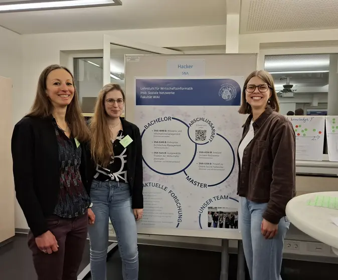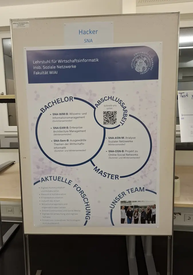 Für unseren Lehrstuhl war die Messe ein besonderes Ereignis: Erstmals waren unsere neue Lehrstuhlinhaberin Prof. Dr. Janine Hacker sowie unsere neue Doktorandin Nina Sabo mit dabei, ebenso wie unsere frischgebackene Doktorin Theresa Henn-Latus. Unser zum Teil neu besetztes Team stellte sich vor und präsentierte aktuelle Forschungsgebiete sowie anstehende Veranstaltungen.