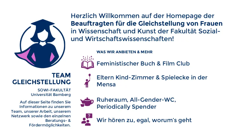 Unsere Arbeit bezieht sich hauptsächlich auf unsere Fakultät und richtet sich demnach speziell an deren Mitglieder. Gern verweisen wir auf das Frauenbüro, die Frauenbeauftragten der Universität Bamberg sowie auf die Vizepräsidentschaft für Diversität und Internationales und ihr Büro als universitätsweite Stellen in Fragen von Geschlechtergleichstellung, Vielfalt, Chancengleichheit und Antidiskriminierung.