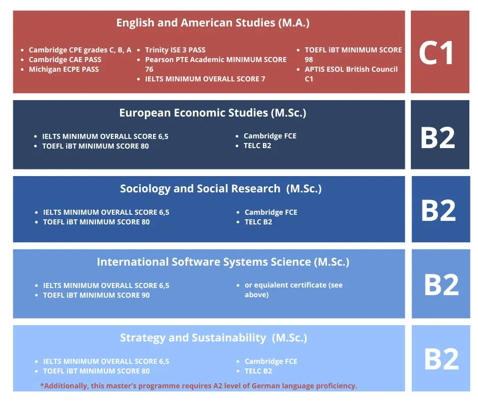 - Eine Bestätigung, dass Ihr Vorstudium teilweise oder vollständig auf Englisch unterrichtet wurde (Medium of Instruction) reicht als Nachweis Ihrer Englischkenntnisse nicht aus