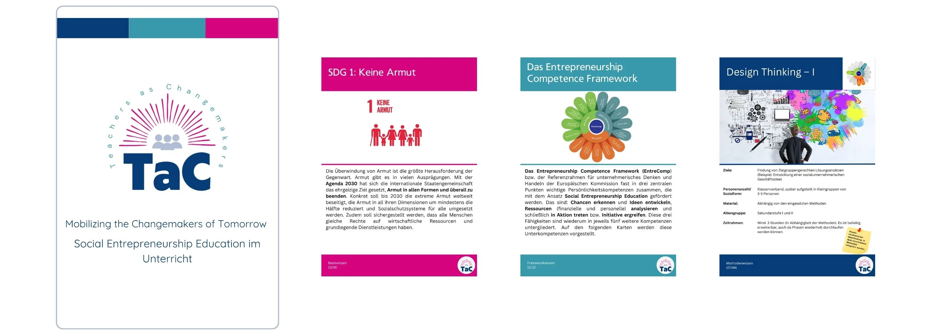 Im Rahmen von TaC haben wir eine Toolbox für Lehrkräfte entwickelt. Die Toolbox vermittelt ihnen Wissen zu den Themen Nachhaltigkeit und gemeinwohlorientiertes Unternehmertum und zeigt, wie dieses anhand von Zukunftsmethoden praxisnah in den Unterricht integriert werden kann. Hier können Sie die Toolbox(6.0 MB) und die Anleitung(455.6 KB) herunterladen.