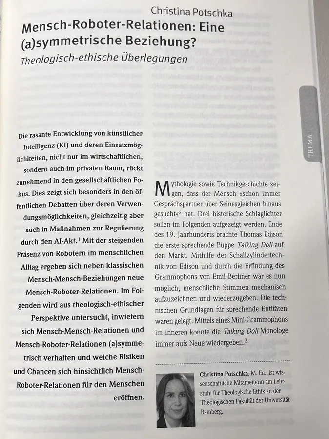 Christina Potschka untersucht in einem Beitrag aus theologisch-ethischer Perspektive, inwiefern sich Mensch-Mensch-Relationen und Mensch-Roboter-Relationen (a)symmetrisch verhalten und welche Risiken und Chancen sich hinsichtlich Mensch-Roboter-Relationen für den Menschen eröffnen.