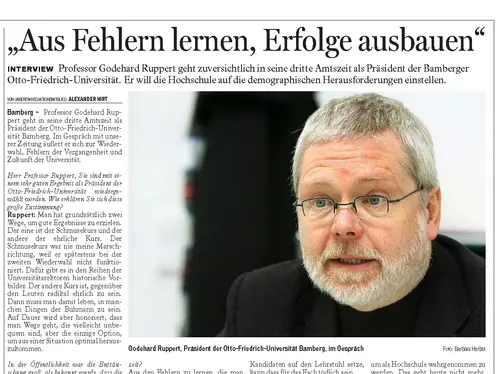 Den Wortlaut finden Sie mit freundlicher Genehmigung des Fränkischen Tags hier(600.4 KB, 1 Seite) © Mediengruppe Oberfranken - Redaktionen Verwaltung GmbH - "Aus Fehlern lernen, Erfolge ausbauen". INTERVIEW Professor Godehard Ruppert geht zuversichtlich in seine dritte Amtszeit als Präsident der Bamberger Otto-Friedrich-Universität. Er will die Hochschule auf die demographischen Herausforderungen einstellen
